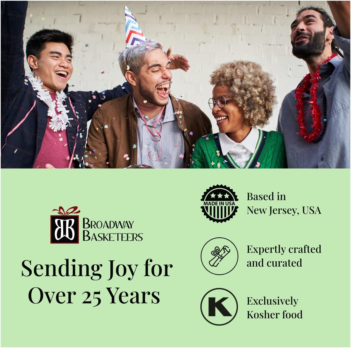 - CERTIFIED KOSHER: Delivering quality for over 25 years! Each certified kosher gift basket is made with care and contains only premium ingredients. All Broadway Basketeers items are designed, assembled, and ribboned in our certified facility.