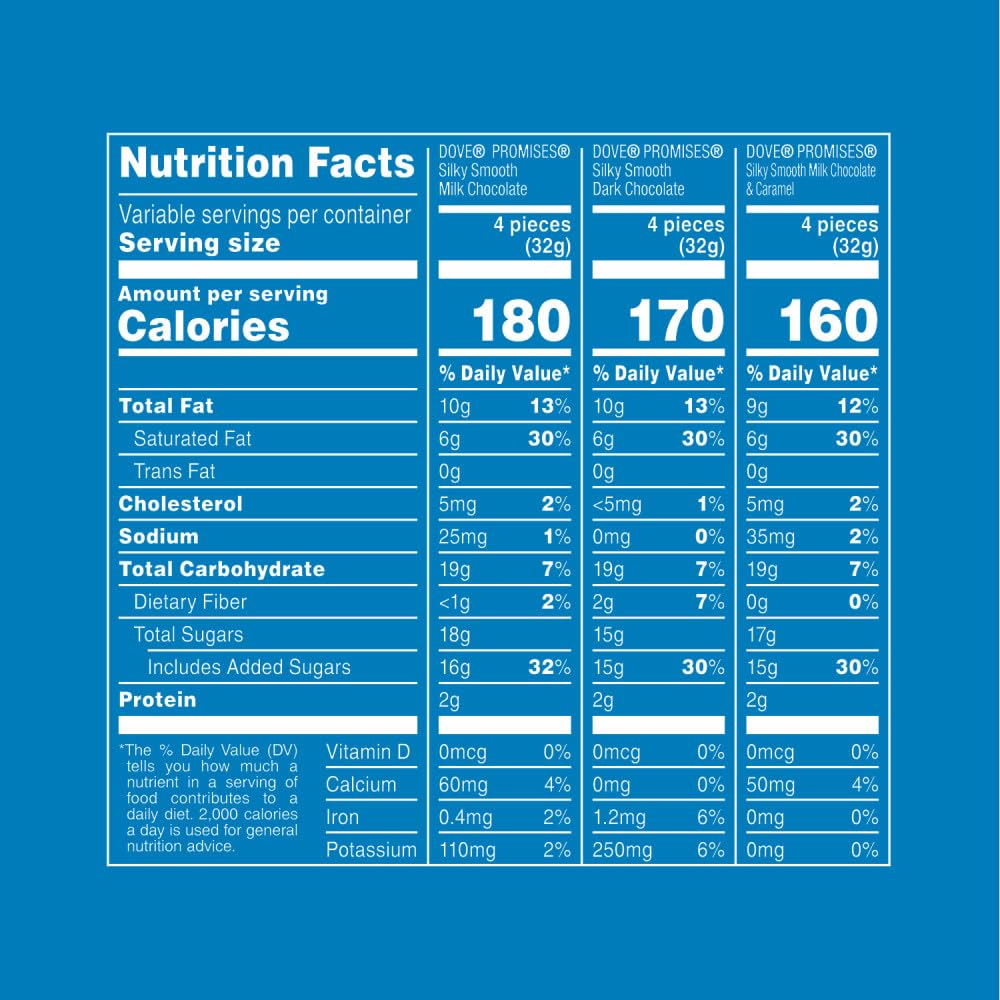- Indulge with this 2-pound bulk candy bag containing the luscious flavors of Milk Chocolate & Caramel, Dark Chocolate, and Milk Chocolate DOVE PROMISES