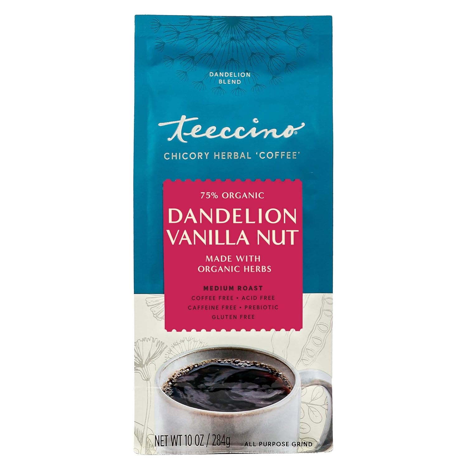 Teeccino Dandelion Vanilla Nut Herbal Coffee - Caffeine-Free Coffee Alternative with Prebiotics, Gluten Free, Acid Free - Medium Roast, 10 oz