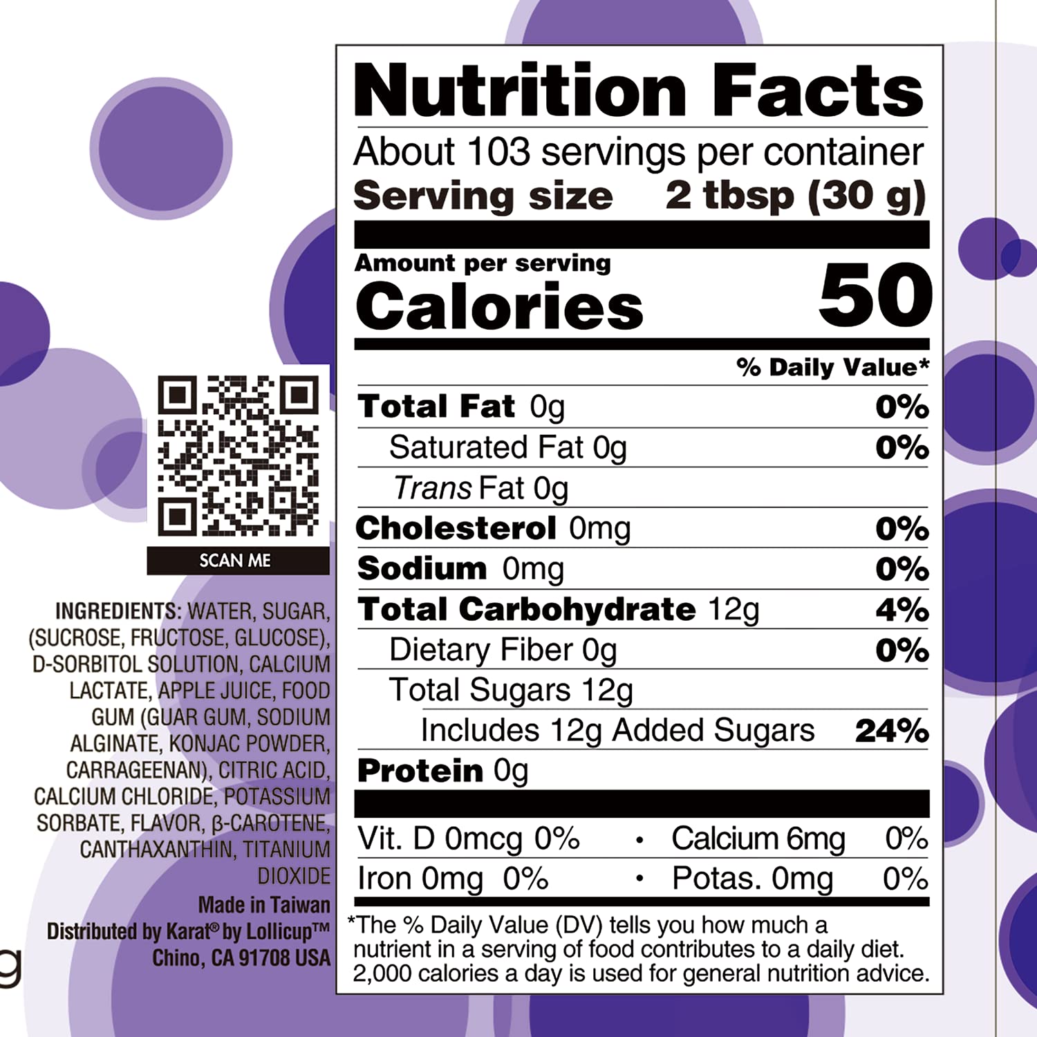 - Ingredients: Water, Sugar, (Sucrose, Fructose, Glucose), D-Sorbitol solution, calcium lactate, Apple Juice, Food Gum (Guar Gum, sodium Alginate, Konjac Powder, Carrageenan), Citric Acid, Calcium Chloride, Potassium Sorbate, Flavor, b-Carotene, Titanium Dioxide,
