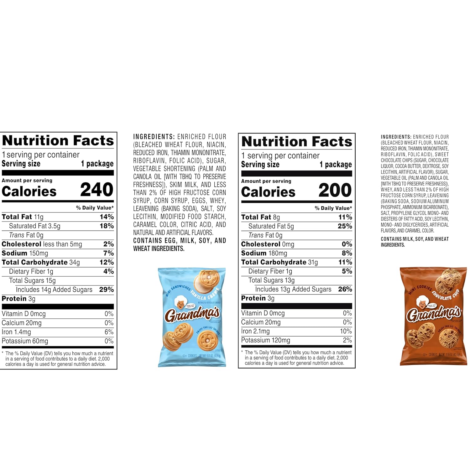 - Grandma’s Mini Chocolate Chip Cookies: loaded with chocolate chips in every cookie Grandma’s Mini Vanilla Sandwich Crème Cookies: Sweet vanilla crème sandwiched between crispy vanilla cookies in every delicious mini cookie bite