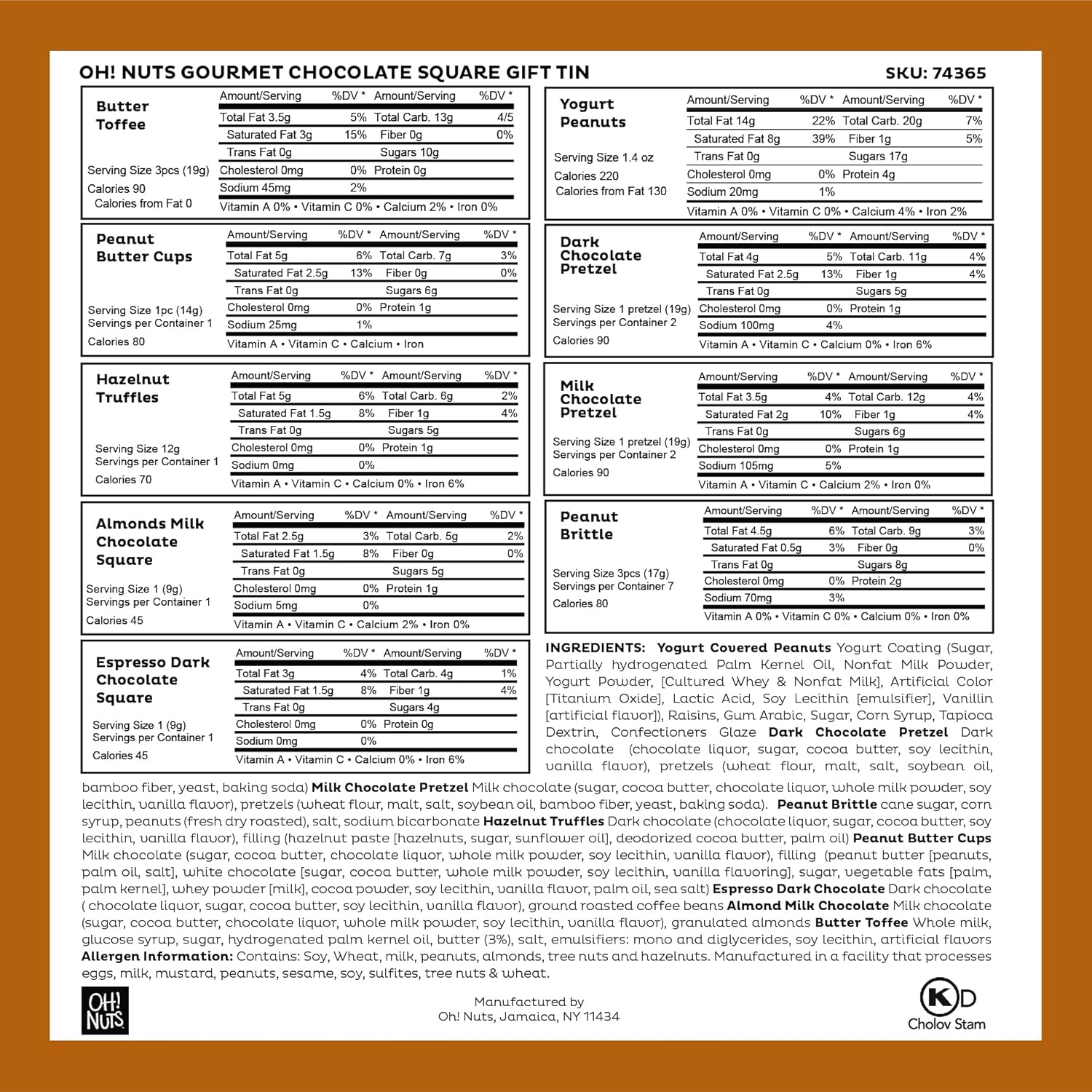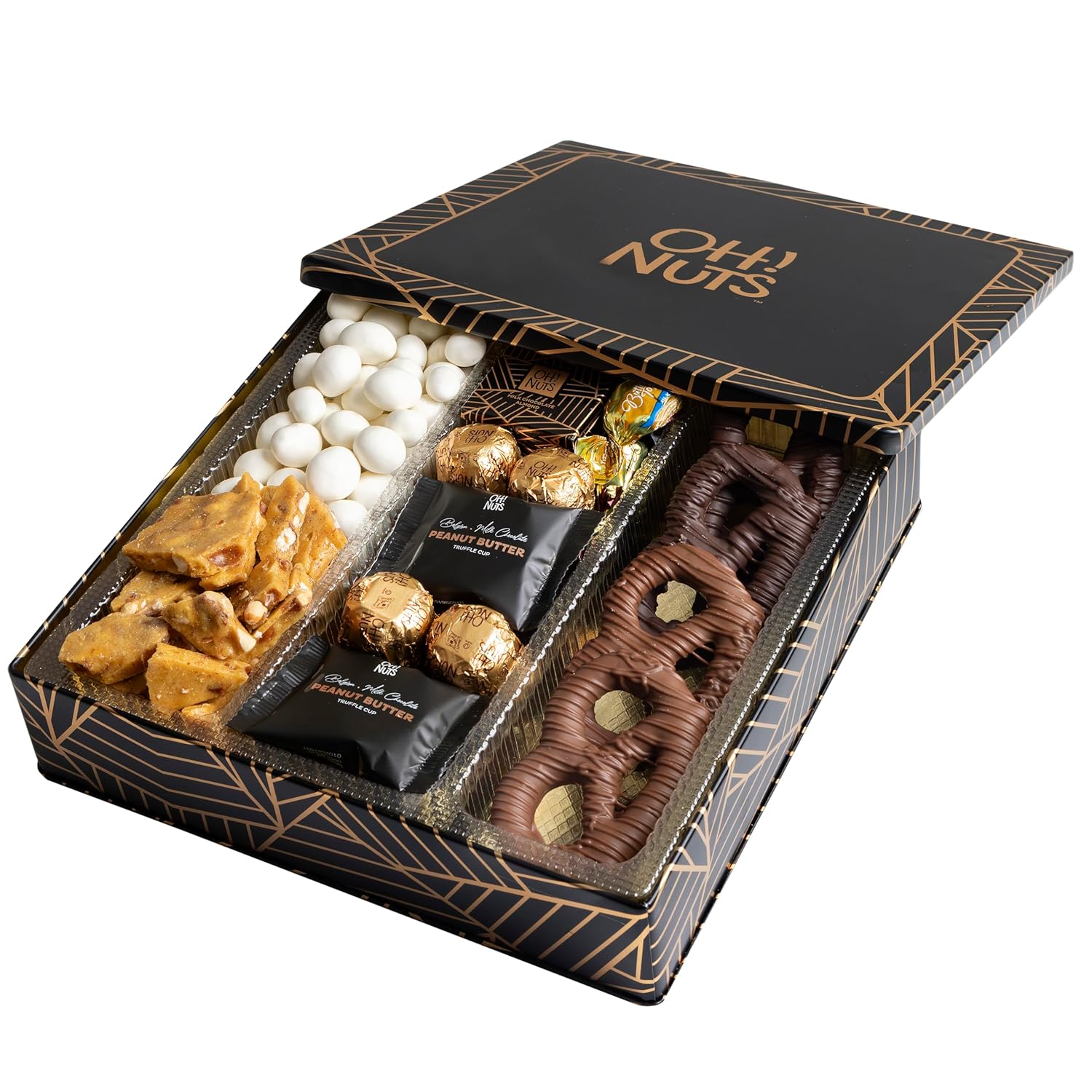 - A selection of gourmet delights: Indulge in a variety of gourmet treats, including Brittle, Milk And Dark Chocolate Pretzels, Peanut Butter Truffle Cups, Caramel, Milk And Dark Chocolates, Yogurt Peanuts, and Hazelnut Truffles.