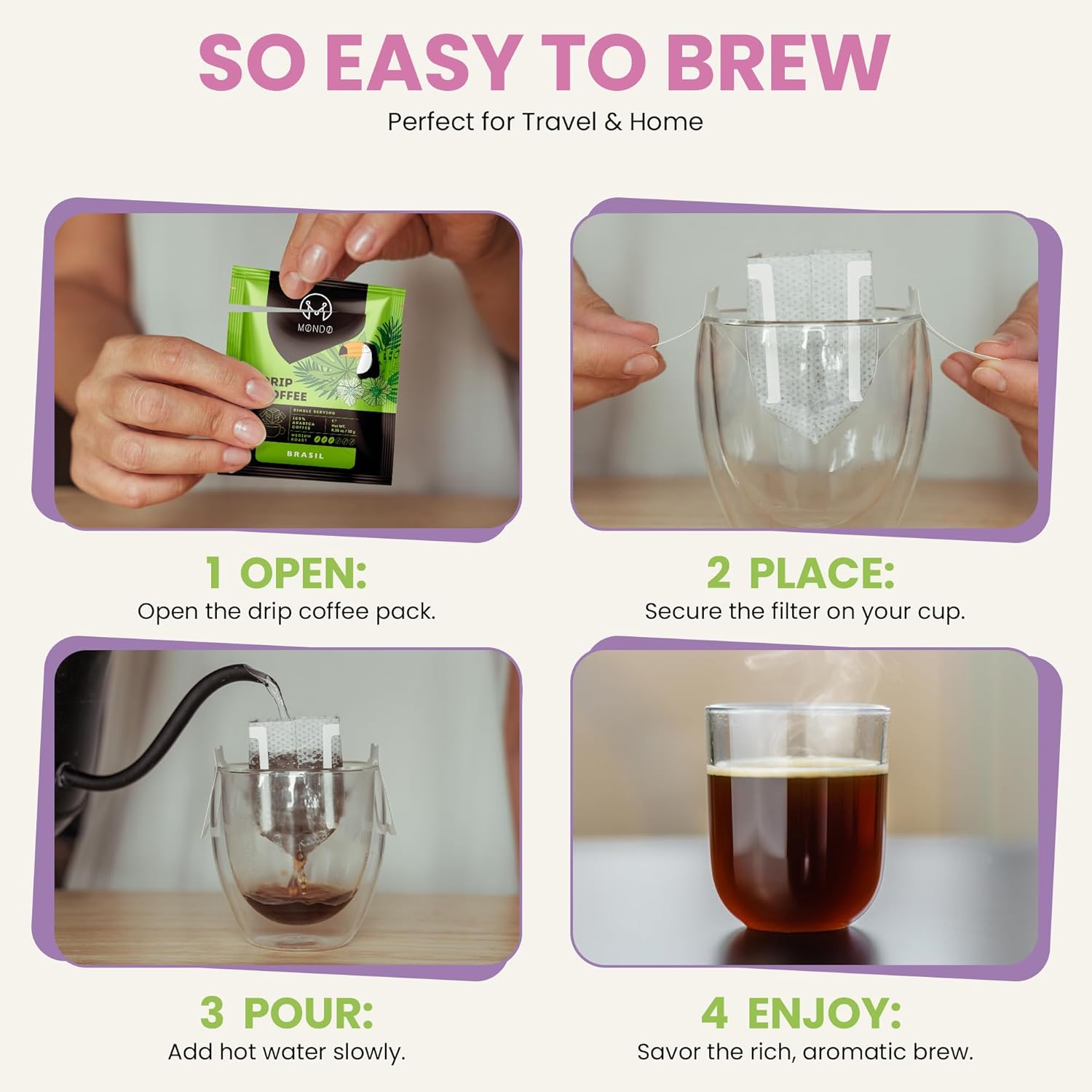 - Portable Pour-Over Perfection - Mondo Drip Coffee simplifies your coffee ritual. This compact, disposable coffee drip bag is your go-to choice for camping, travel, the office, or home brewing. Just add hot water!