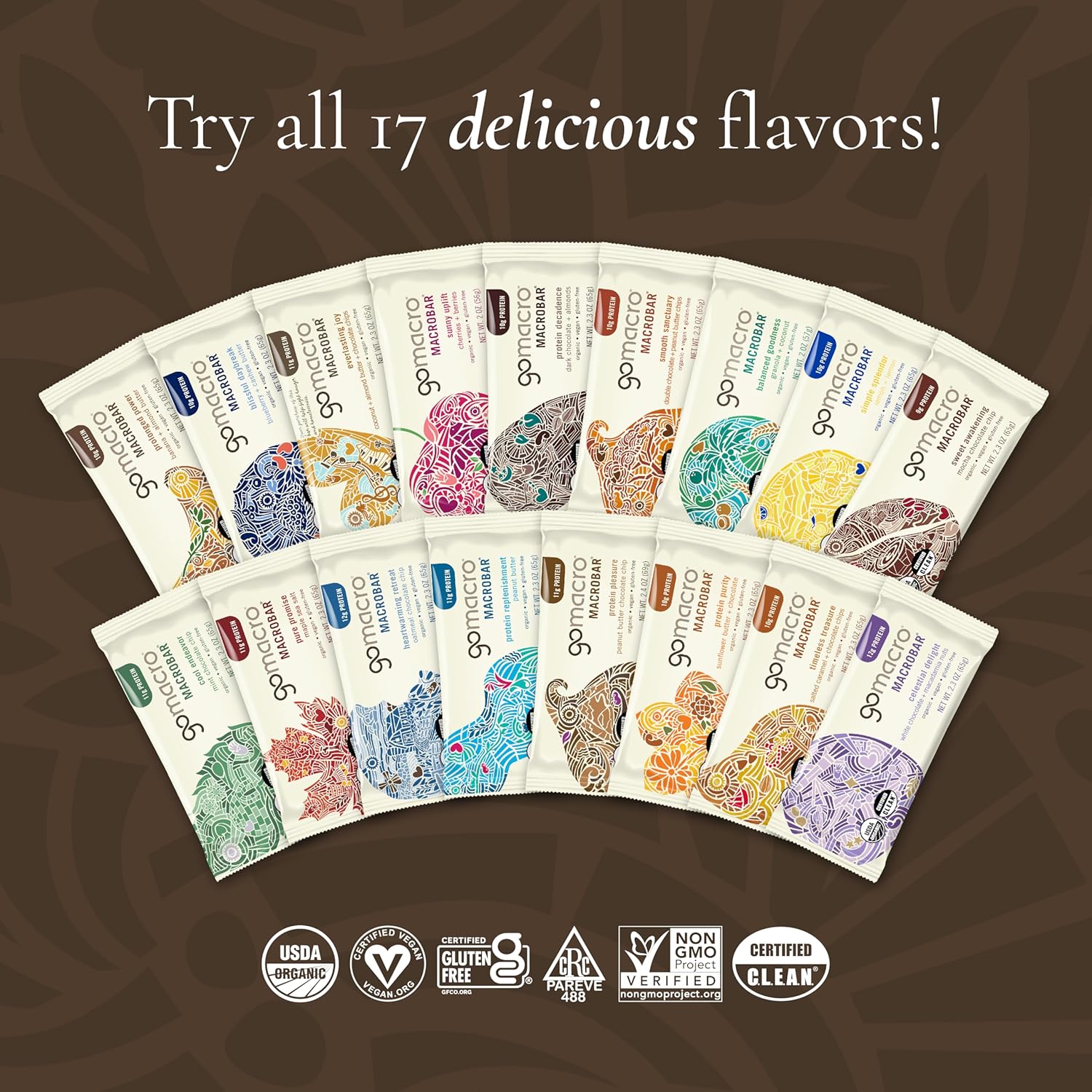- CERTIFICATIONS YOU CAN TRUST: All GoMacro protein bars are Certified Organic, Vegan, Gluten-Free, Kosher, Non-GMO, C.L.E.A.N., and Soy-Free so you can snack with confidence. If there were a certification for delicious, we’d have that too!