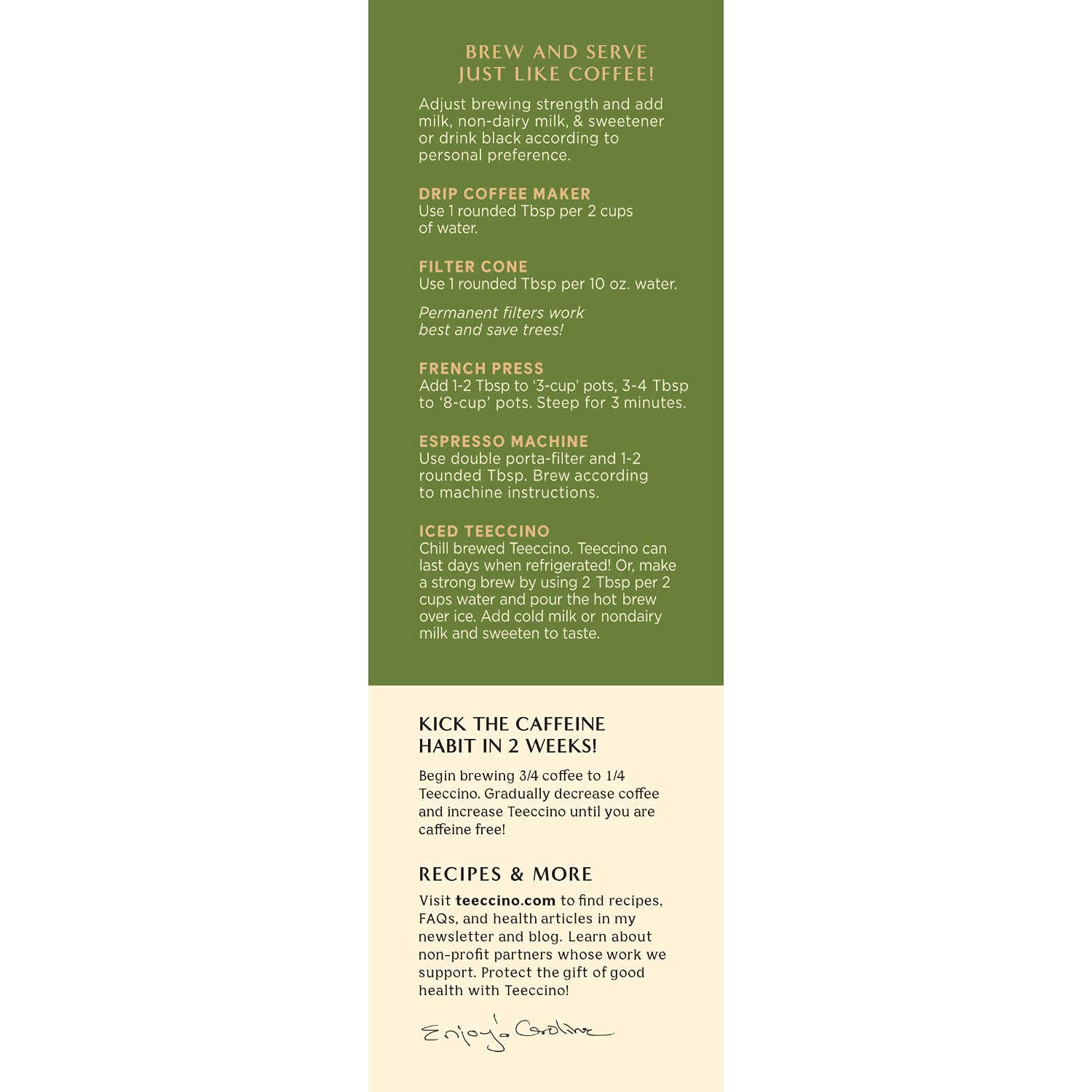 - BREW TEECCINO LIKE COFFEE - Our all-purpose grind brews in any kind of coffee maker. Perfect for a cappuccino or latte, delicious hot or iced. Quit coffee by blending with Teeccino & gradually weaning off over 2 weeks.