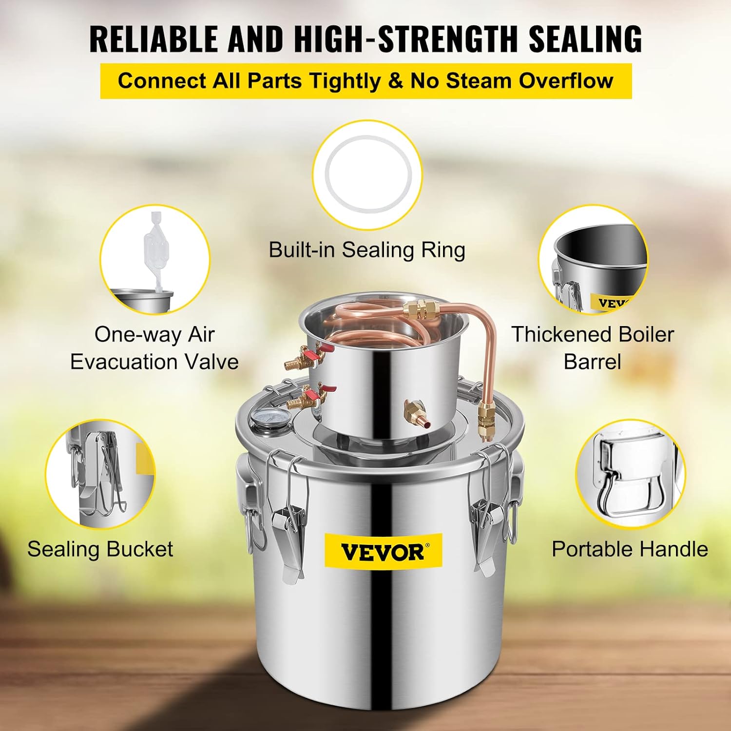 - 【VERSATILE HEATING METHODS】- This home distilling kit is brilliant for both beginners and experts. It is perfect for distilling fruit wine, water, purifying water, distilling brandy. The thickened fermentor bottom is suitable for all kinds of heating methods, including gas stoves, ceramic stoves, electric coil stoves, etc.