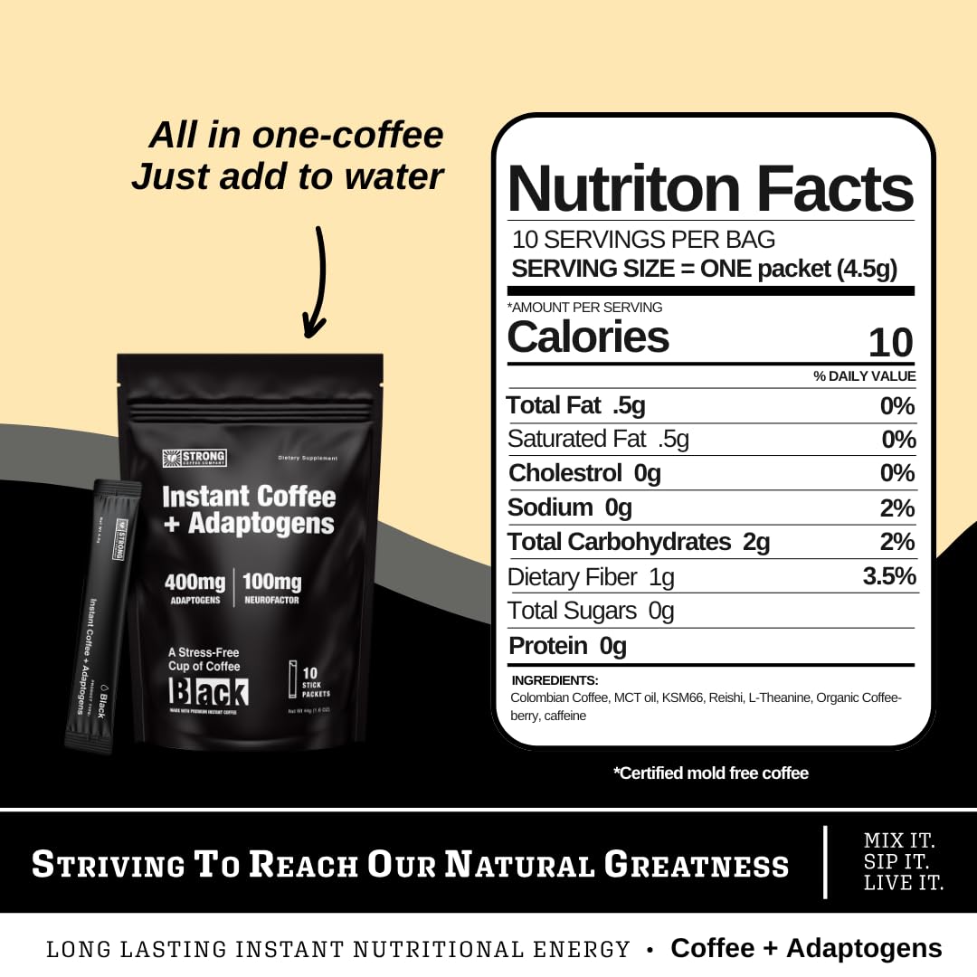 STRONG COFFEE COMPANY, ORGANIC INSTANT BLACK COFFEE – Individual Servings, Extreme Focus, Adaptogen with L-Theanine & Ashwagandha, No Jitters, No Crash (10 Packets)