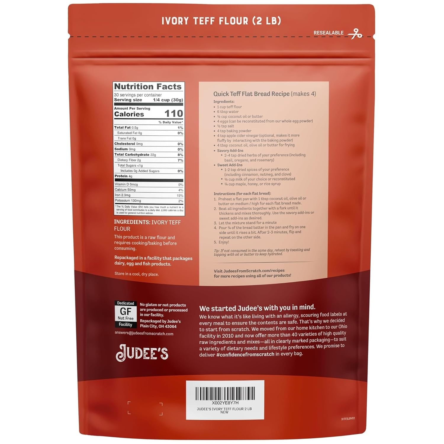 Judee's Ivory Teff Flour 2 lb - Non-GMO, Vegan, Made in USA - Resistant Starch - Great for Making Quick Teff Bread, Injera, Muffins, Pancakes, and Cookies - Gluten-Free and Nut-Free