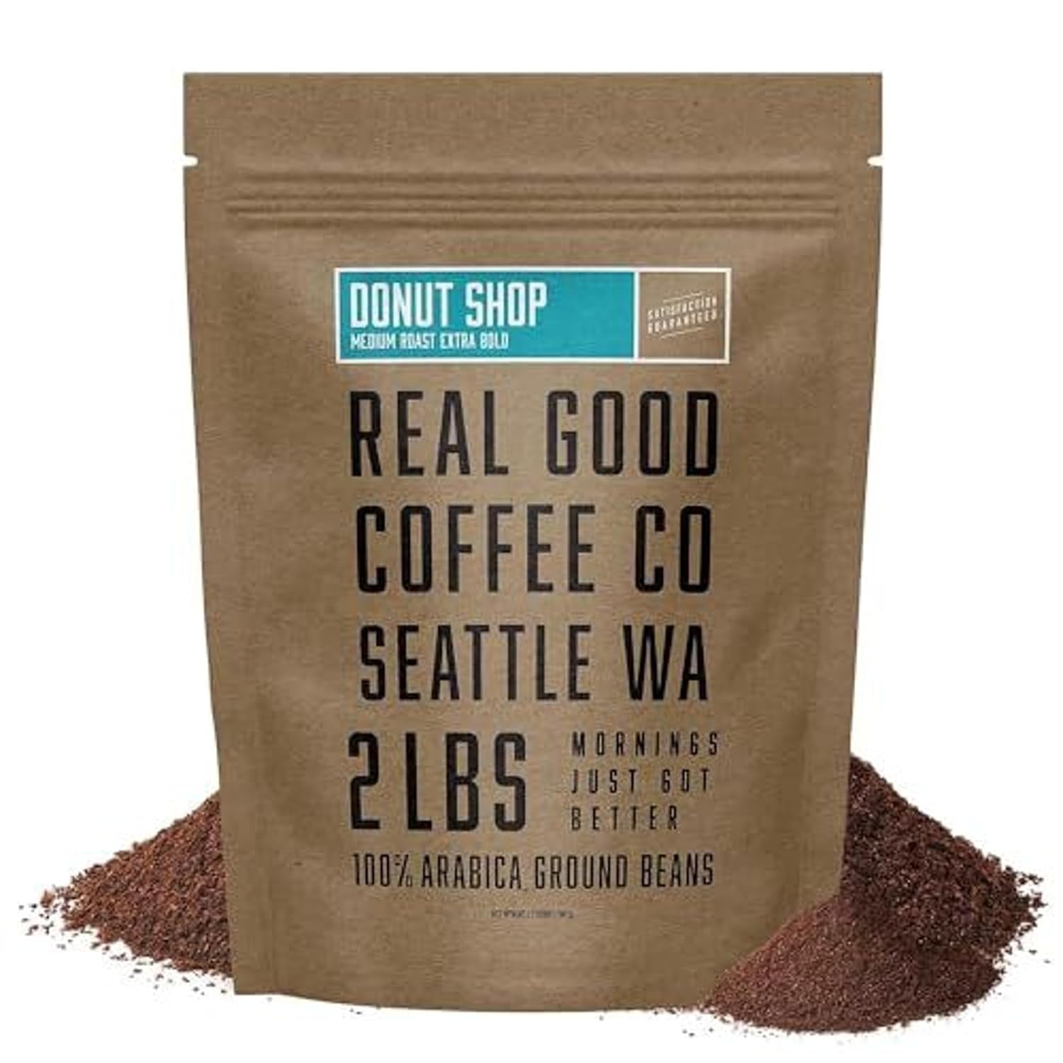 - Real Good Coffee Delight: Experience the delightful flavor of Real Good Coffee Company's Donut Shop Medium Roast, crafted from 100% Arabica beans. This expertly roasted ground donut coffee offers a sweet, smooth taste for any time of day