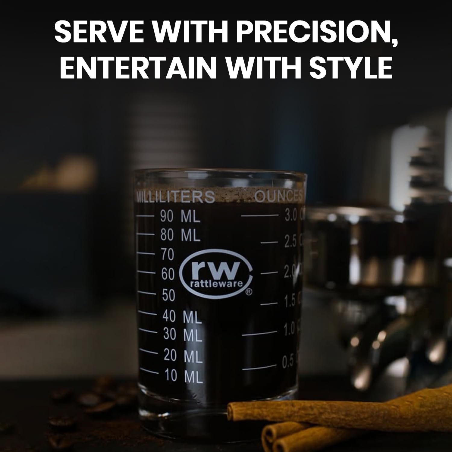 - 𝐃𝐔𝐑𝐀𝐁𝐋𝐄 𝐀𝐍𝐃 𝐒𝐓𝐘𝐋𝐈𝐒𝐇 𝐆𝐋𝐀𝐒𝐒: These Rattleware 3 oz measuring shot glasses are crafted from thick, premium glass for durability and clarity. Perfect for coffee bar accessories, bar carts, or gatherings, they add elegance to espresso cups, shot glasses, and bar accessories collections.