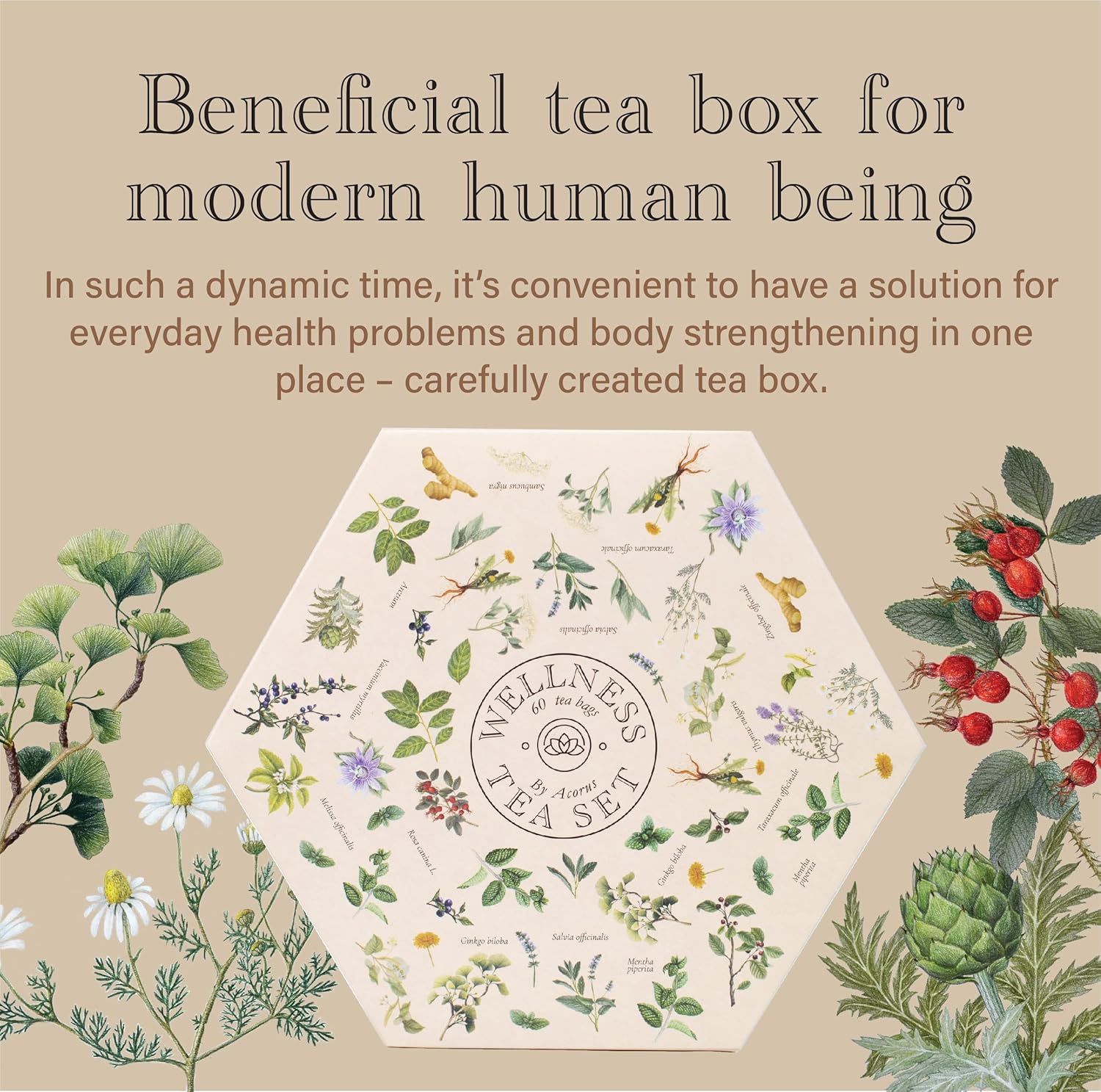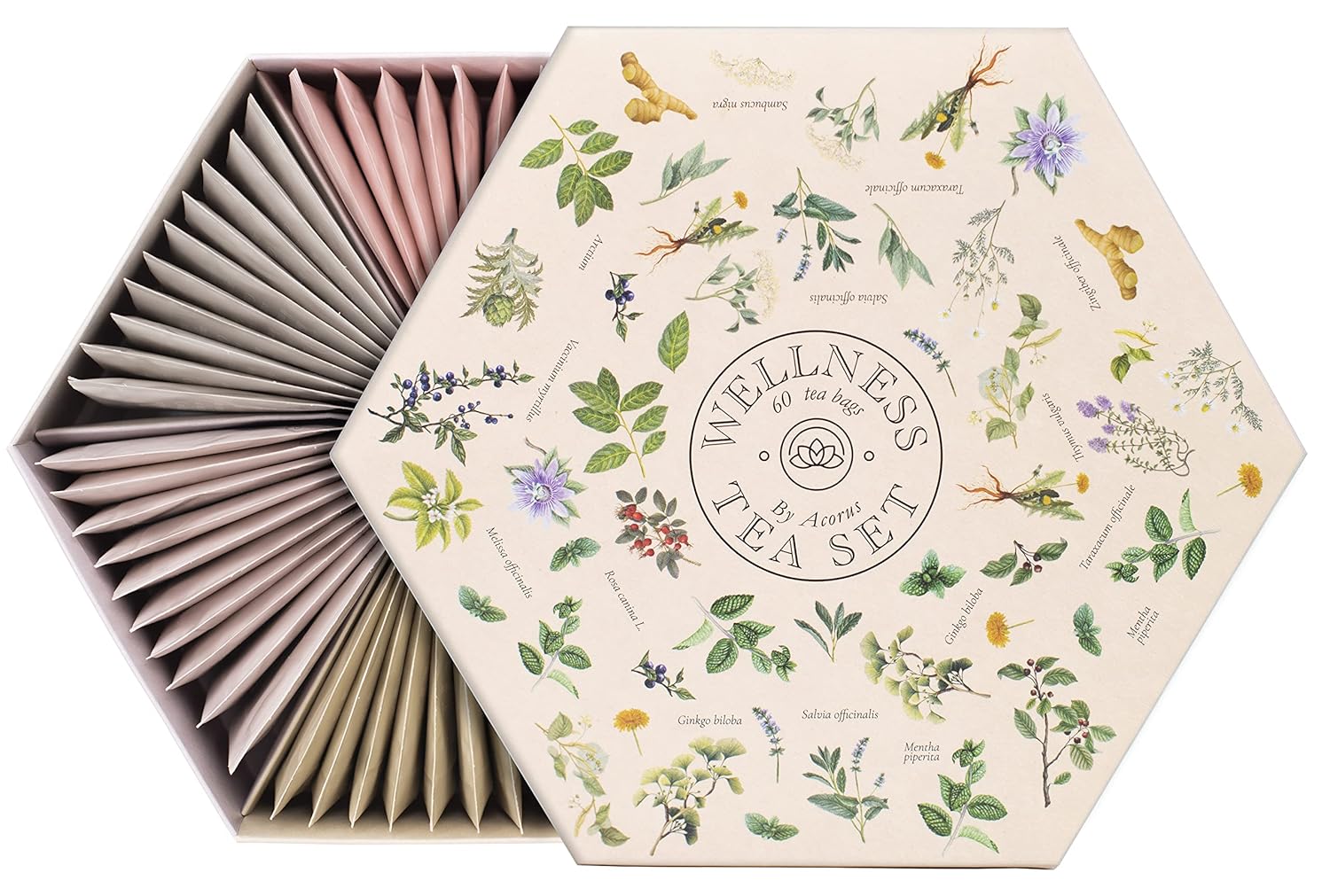 ACORUS Wellness Tea Set – Natural Herbal Tea Variety Pack, Gift Set of 6 Different Teas, 60 Bags Individually Wrapped, Herbal Sampler Box, Harmonious Balance of Taste & Aroma