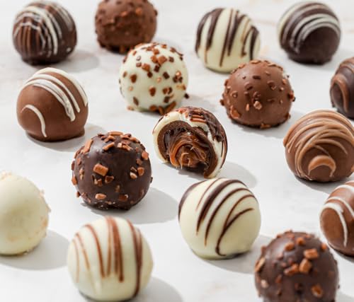 - Assorted Gourmet Truffle Selection: Enjoy a merry mix of rich dark chocolate champagne, silky white tiramisu, creamy milk caramel, red-foiled milk chocolate, Irish crème, coffee drizzle, amaretto, and gold-foiled dark truffles; each bite delivers festive flavor.
