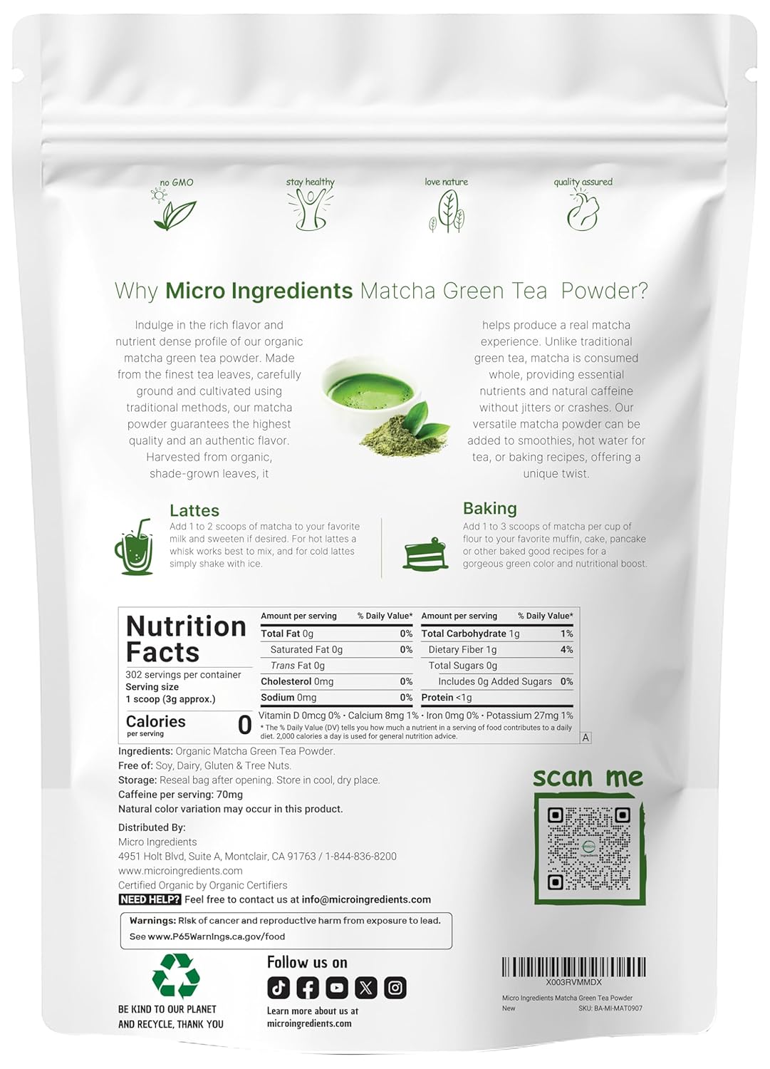 Micro Ingredients Organic Matcha Green Tea Powder, 2 lb | First Harvest, Culinary Grade from Japan | 100% Pure & Unflavored | Great for Tea, Latte & Smoothies | Non-GMO, 0 Calories, Eco-Friendly Packaging
