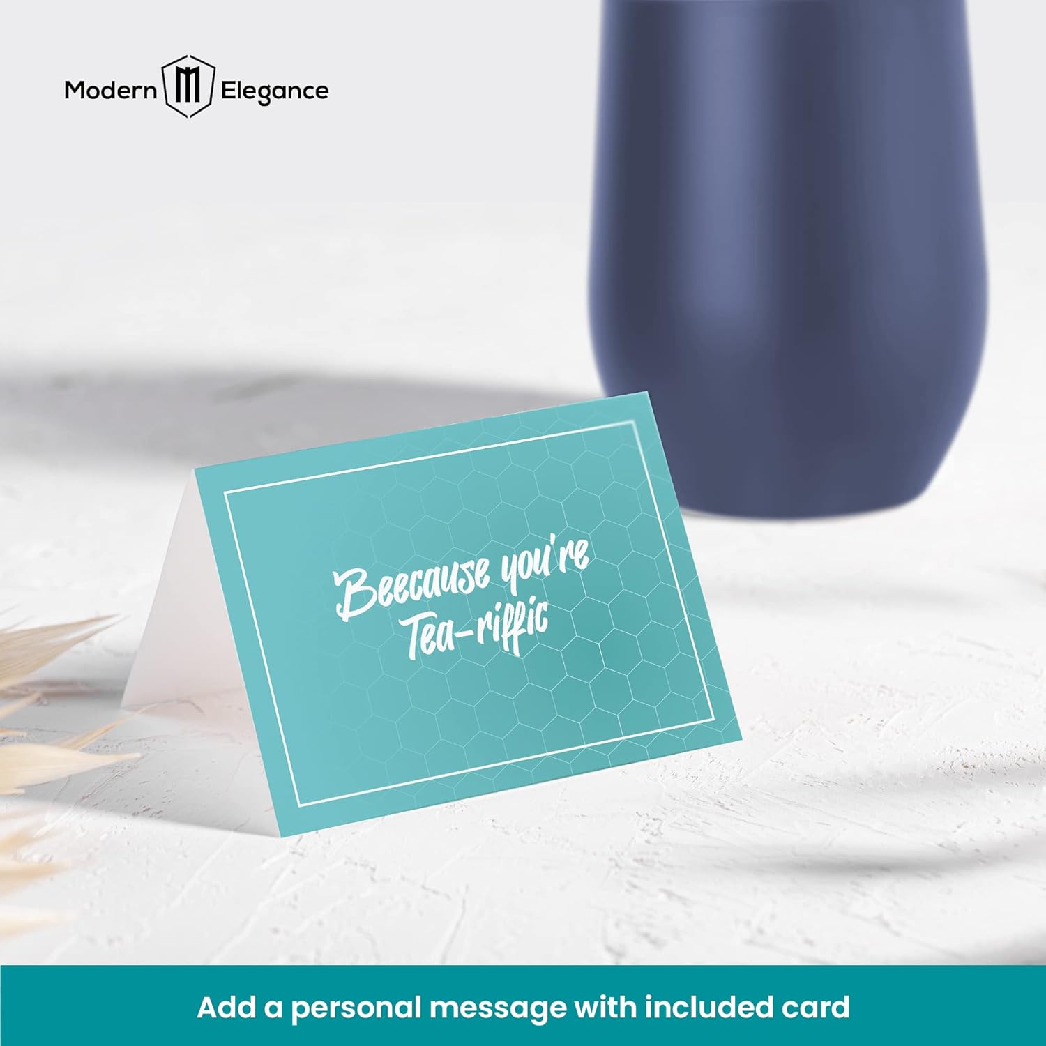 - TEA GIFT SET - Indulge in the ultimate tea experience with our luxurious Tea gift set, beautifully presented in a sturdy, elegant gift box. Modern Elegance tea gift sets for tea lovers basket includes a 12oz vacuum insulated tumbler, a tea collection sampler of 15 unique flavor blends, 10 pure honey straws, a tea-spoon squeezer, a cute squirrel tea bag holder, and a greeting card to write a personal message. The perfect tea gift for tea lovers women , men or as a get better soon care package.