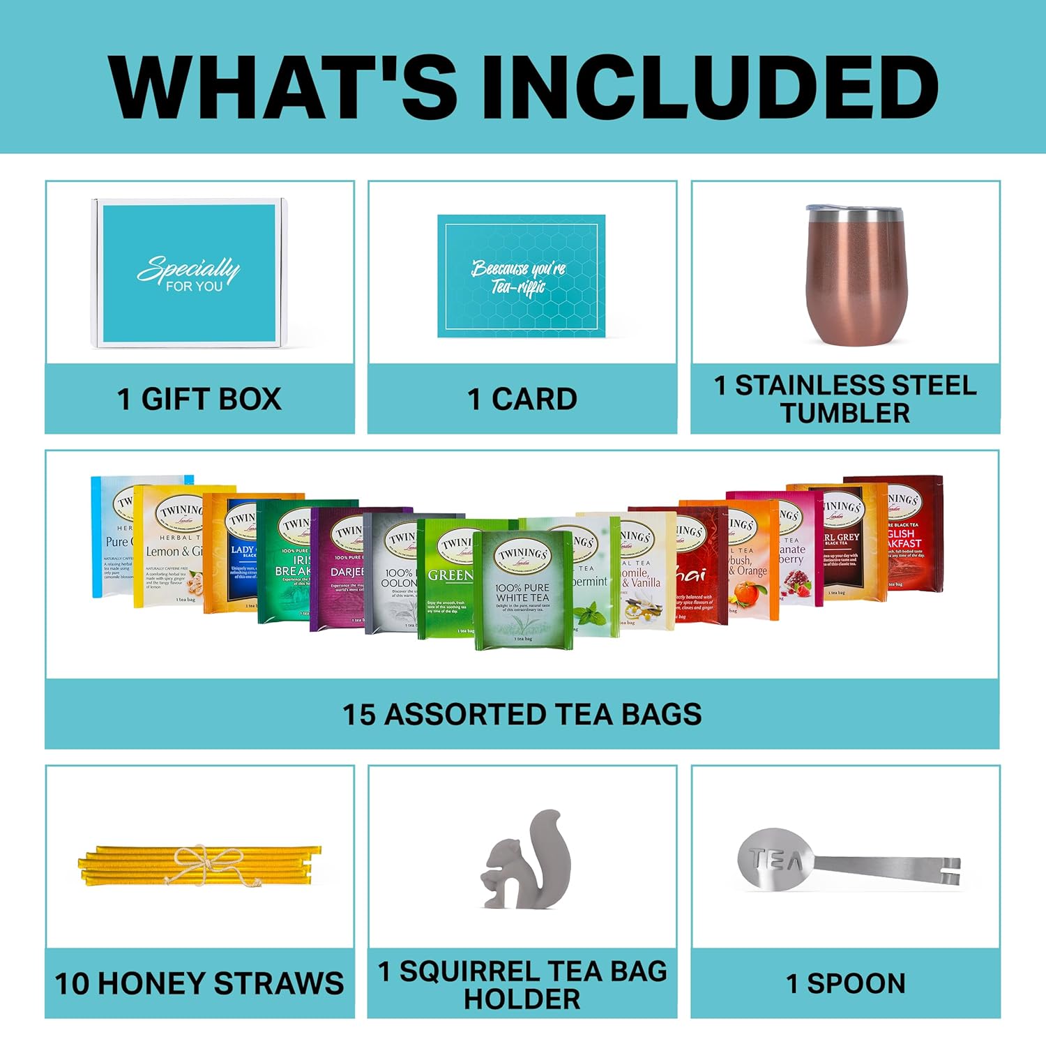 - THE IDEAL GIFT FOR TEA LOVERS & HOLIDAY OCCASIONS: Looking for a great gift for a tea lover? The Modern Elegance Tea Tumbler Gift Set is an ideal holiday gift. With 15 premium tea blends, a charming tea bag holder, a washable spoon, and an insulated tumbler, this set is ready to gift. Whether for Christmas, birthdays, or any special occasion, it’s the ideal choice for those who love to enjoy a cup of tea in style.