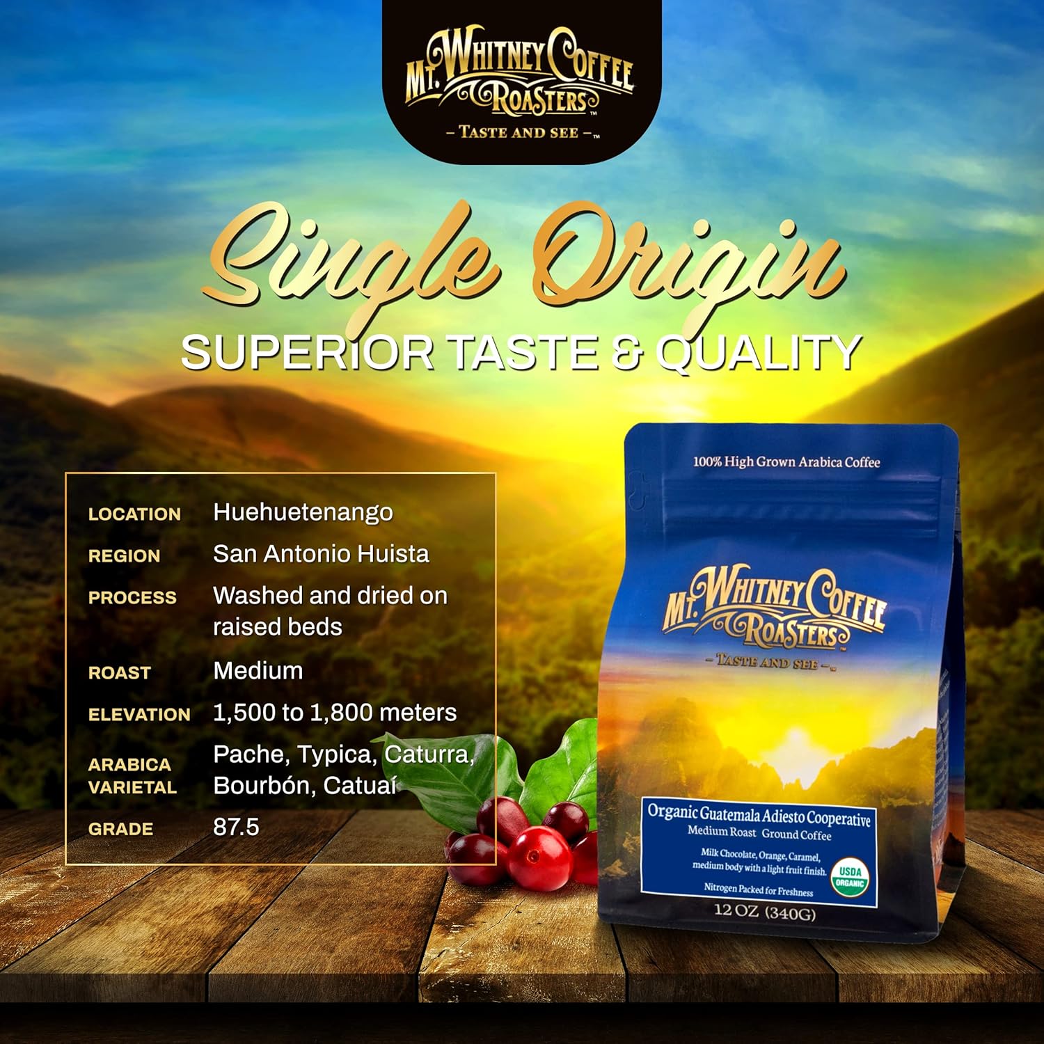 - SWEET AND FRUITY NOTES - Enjoy Guatemala coffee with notes of medium-bodied milk chocolate, caramel, and orange, finishing with a light fruit and wine aftertaste. The mild, refined, and smooth finish of our Mt. Whitney Guatemala Adiesto Cooperative organic coffee is the perfect pick-me-up when you need that energy boost.