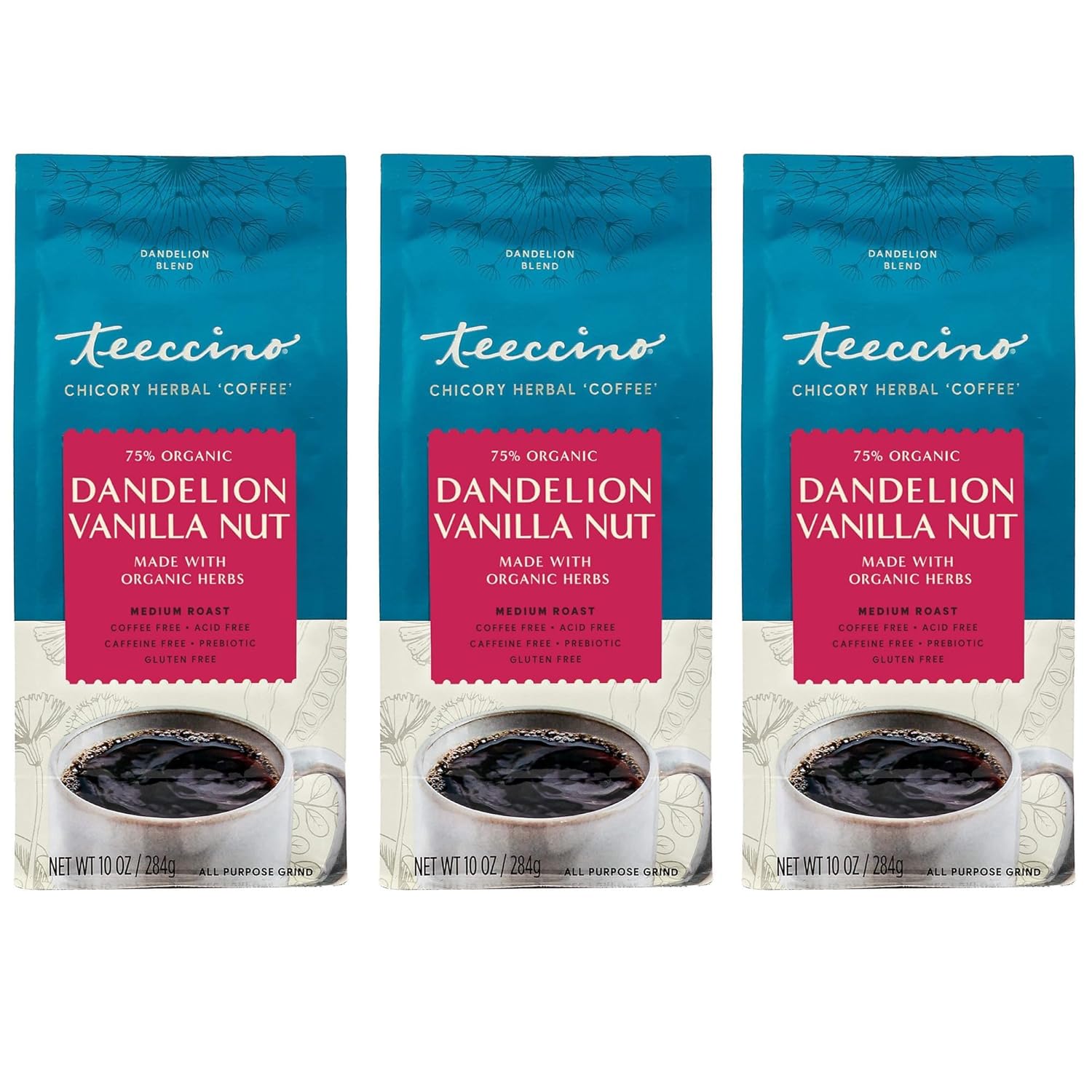 Teeccino Dandelion Vanilla Nut Herbal Coffee - Caffeine-Free Coffee Alternative with Prebiotics, Gluten Free, Acid Free - Medium Roast, 10 oz, Pack of 3