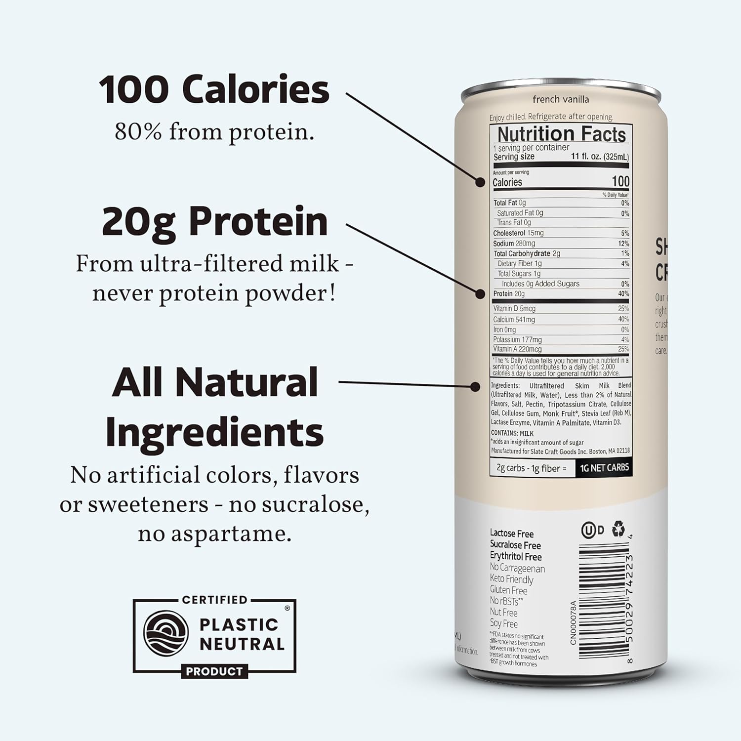 Slate Milk - High Protein Milk Shake - French Vanilla - Lactose Free, 20g Protein, 1g Sugar, 100 Calories, 1g Net Carbs, No Added Sugar - Natural, Breakfast Boost, Post Workout - 11 fl oz, 24 Cans