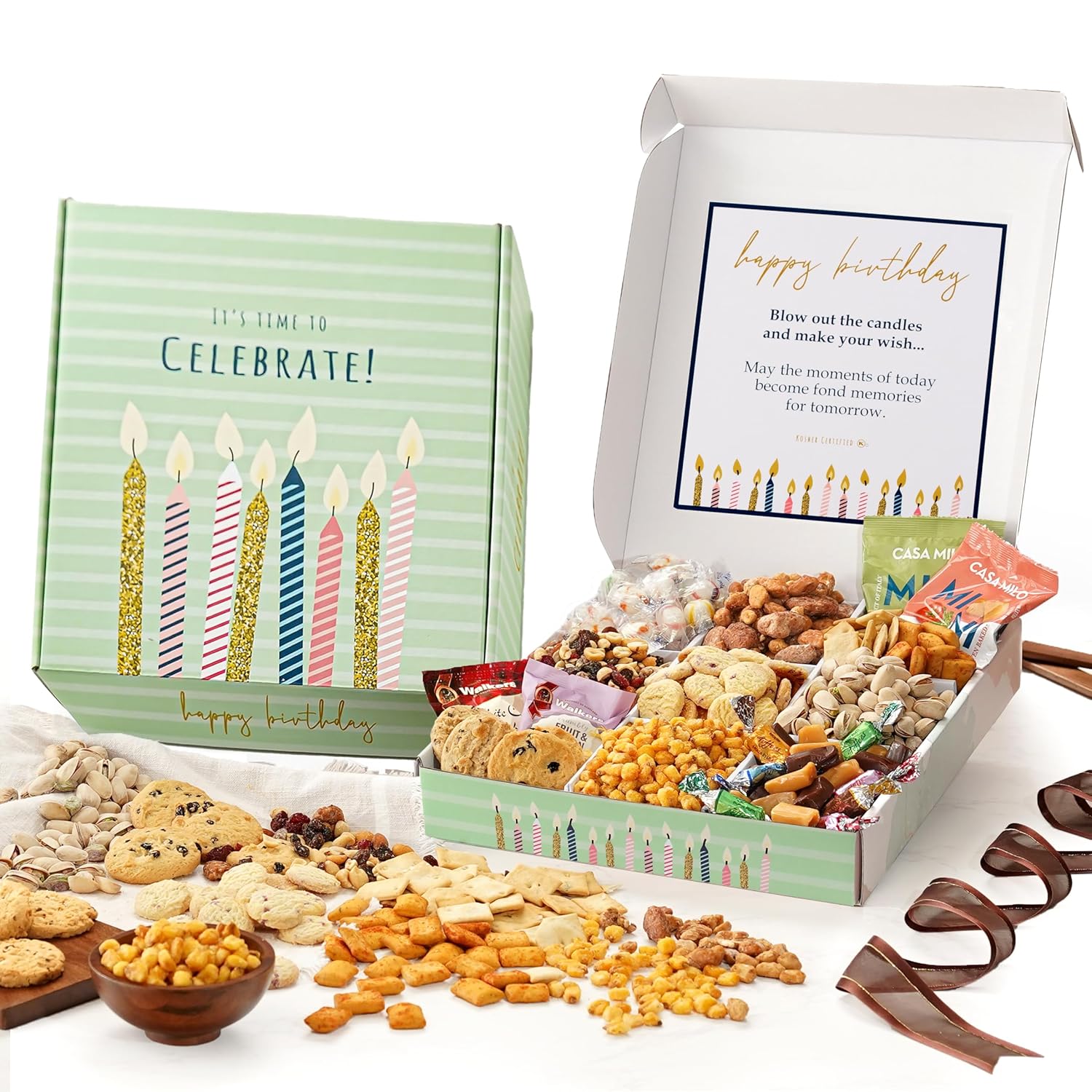 - SWEET: Treat your loved one to our birthday-themed gift box filled with a variety of mouth-watering gourmet delights, including Butter Toffee Mixed Nuts, Roasted Pistachios, Lemon Blueberry cookies, Berry Cherry Trail Mix, Walkers Shortbread Cookies, Toasted Corn Nuggets, and more.