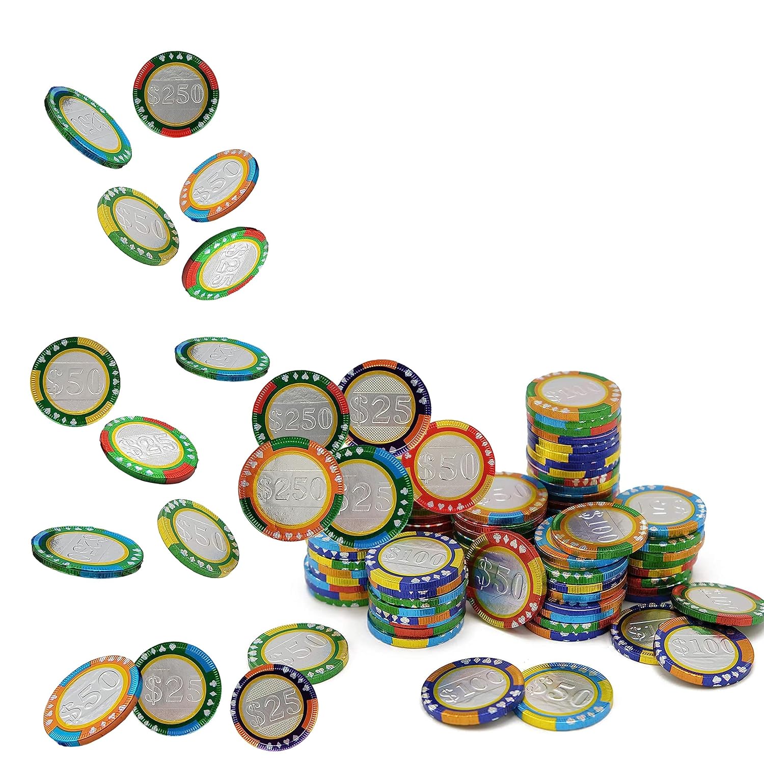 - These chocolate coins are perfect for any themed event. Try them at any birthday celebration, Christmas or Hanukah party, carnivals, and much more. Besides being tasty treats, these colorful, foil-wrapped chocolate coins are ideal for playing dreidel. However, they can be used for other family-friendly games that involve betting. You can choose between our 25 Pack 50 100 500 1000 and 1820 Pack.