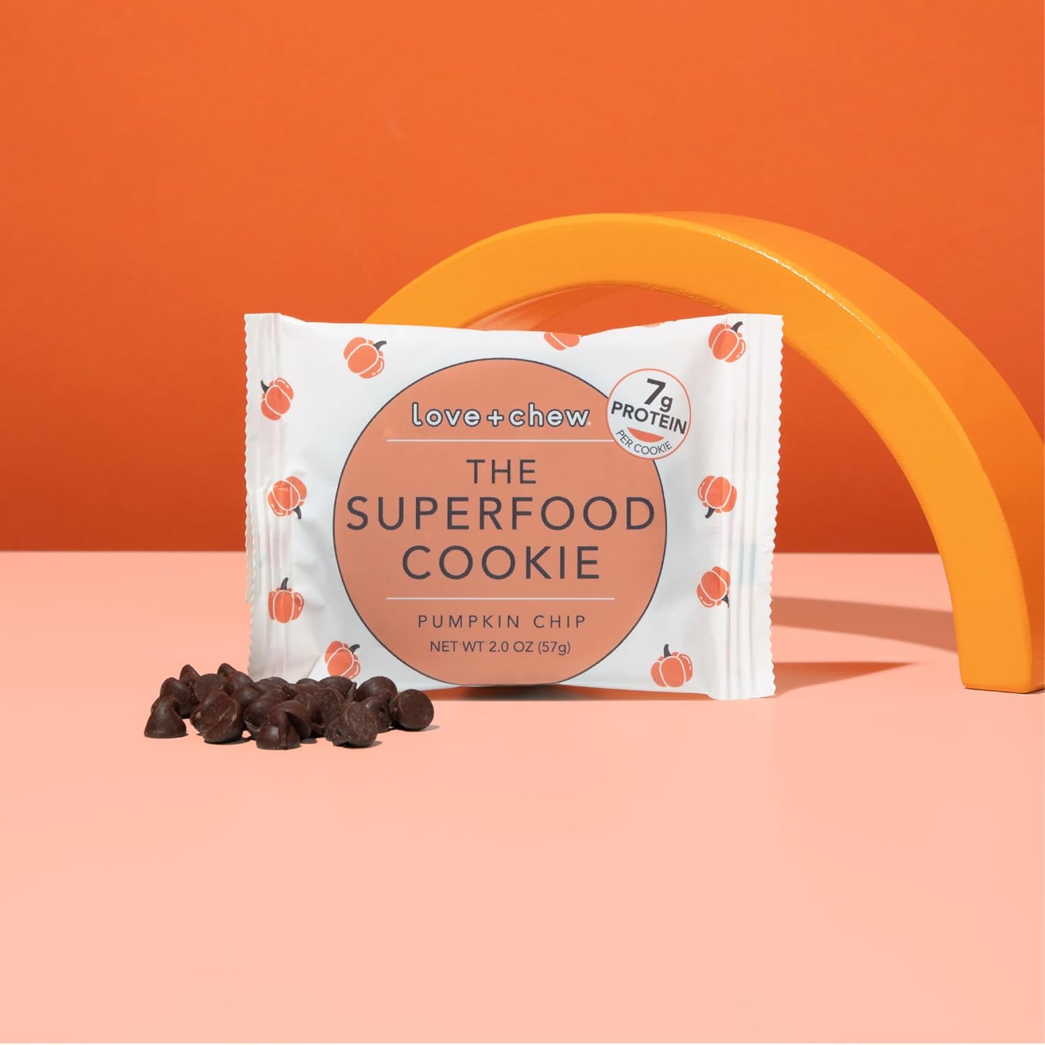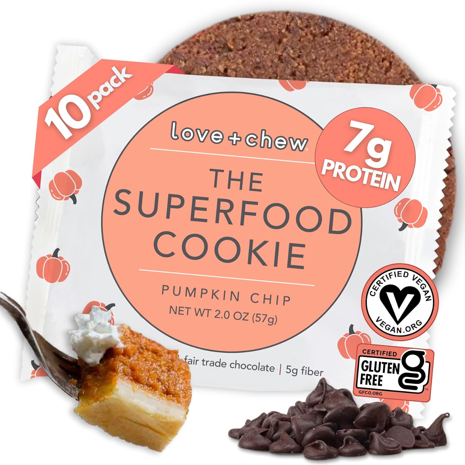 Love + Chew Tasty, Gluten Free Cookies - Pumpkin Chip 10 Count - Vegan - Healthy, Paleo, Non GMO Snacks - Individually Wrapped, Soft Baked Cookies - Made from High Protein Almonds - 2 Ounce Each