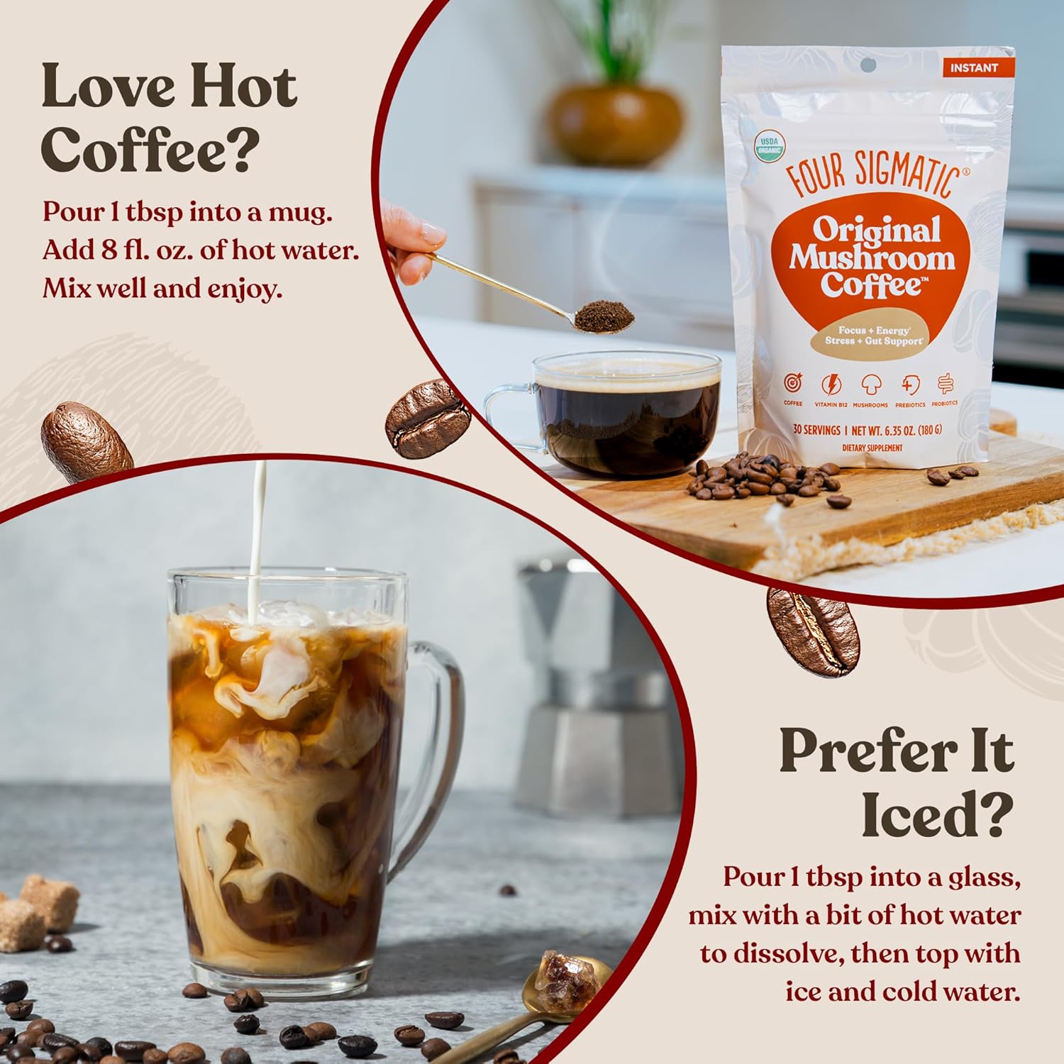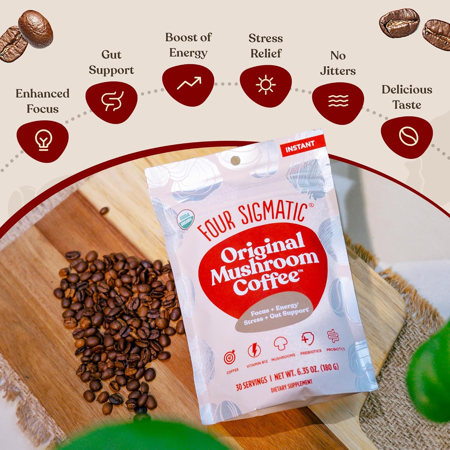 - FUNCTIONAL DOSES FOR REAL NOOTROPIC BENEFITS IN EVERY CUP — At Four Sigmatic, science and nature collaborate to create real magic. Handpicked functional mushrooms and adaptogens are the heart of our mushroom coffee. No shortcuts, just a cup of pure genius to fuel your focus and energy.