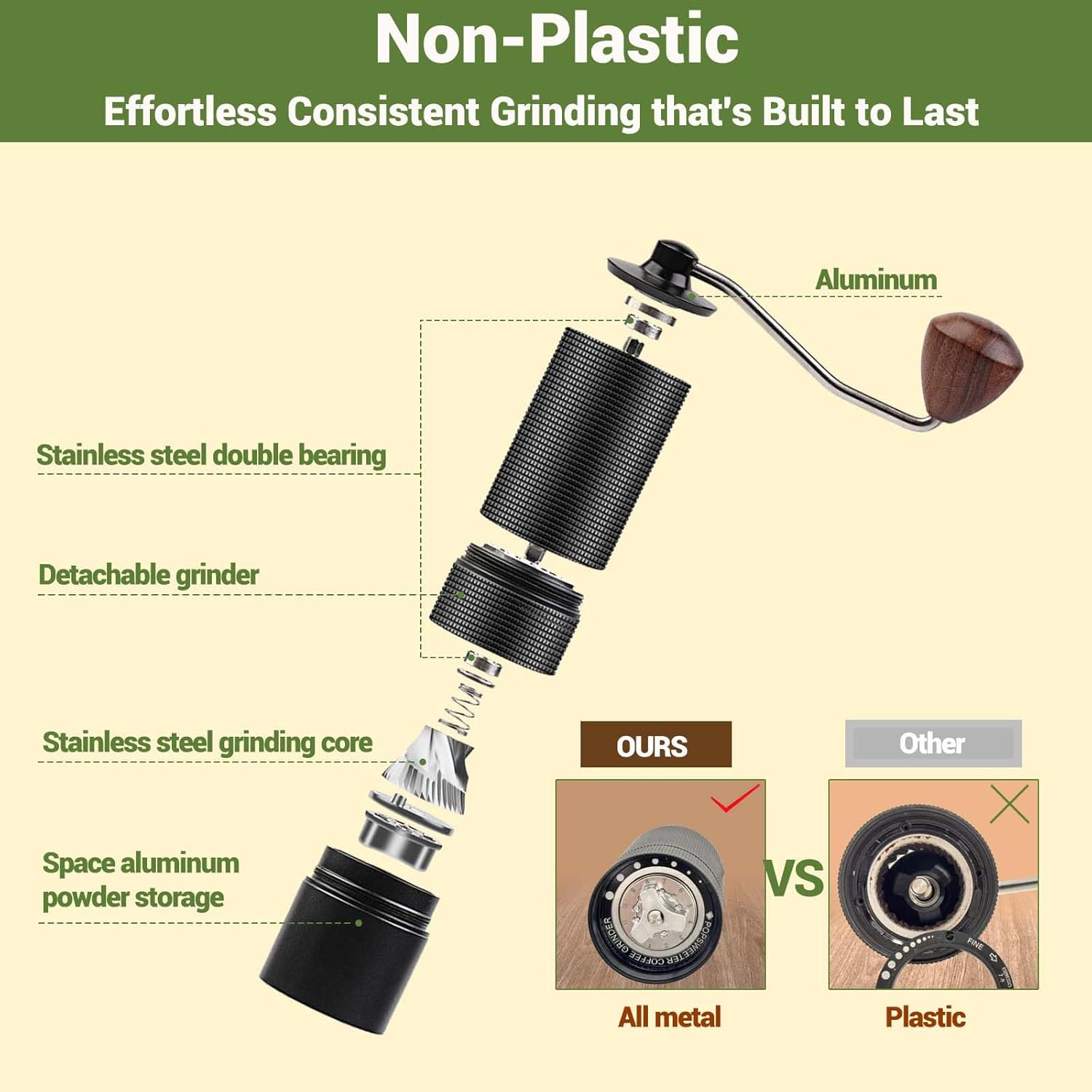 - Portable : The manual coffee bean grinder runs virtually silent so you won't wake up your family or partner while preparing your morning beer, and the long handle is ergonomically designed without Laborious, easy to hold and carry, no sharp blades and electricity, all metal integrated, without any plastic parts.