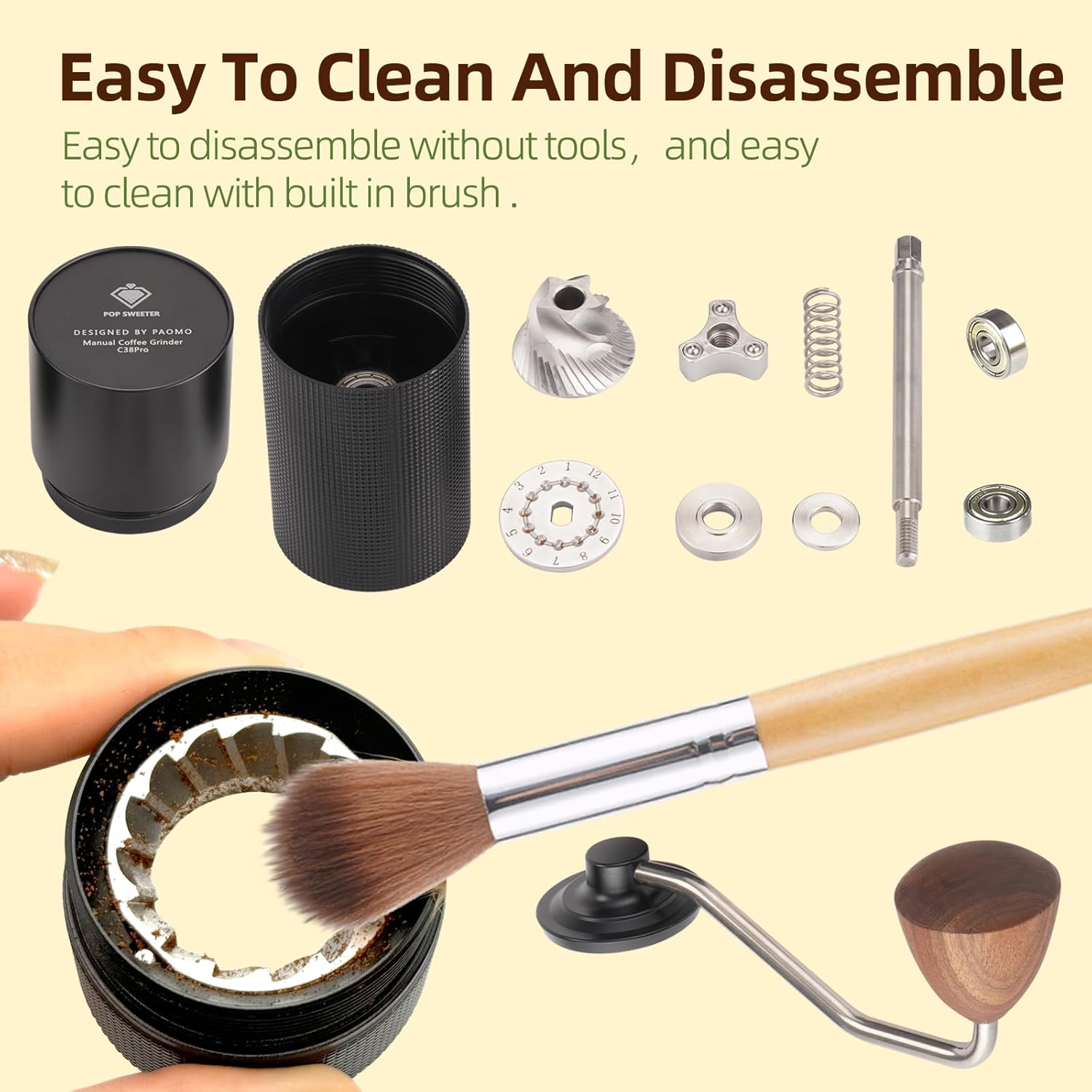 - Easy to clean :innovative design ,can be easily disassembled without tools, Detachable outer ring burrs,Thoroughly clean the deep roasted coffee oil, discover your beans real flavor.