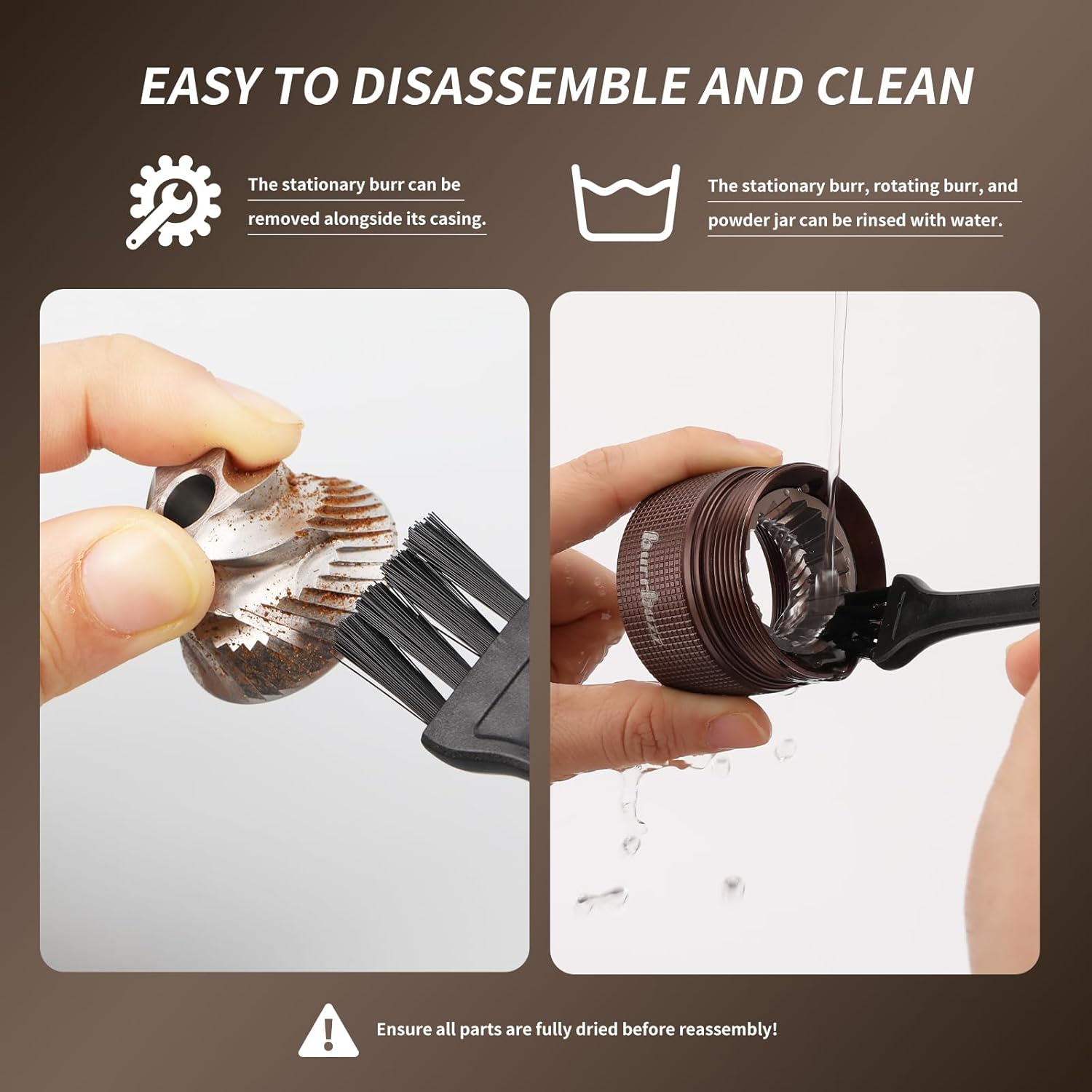 - Easy Cleaning: The Espresso grinder is designed for hassle-free disassembly without the need for any tools. The stationary burr, rotating burr, and powder jar can be rinsed with water, enabling a more thorough cleaning process. Just ensure all parts are fully dried before reassembly.