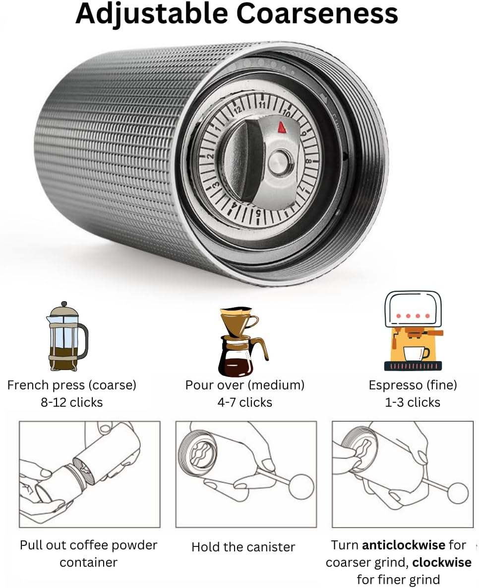 - Double Bearing Optimum Grinding Grainsize Adjustable: The coffee grinder has double bearings, which are more durable and stable than single bearings. You can adjust the knob on the top of the hand crank to control the size of the coffee grounds. The adjustable grinding fineness can meet the needs of different brewing methods, such as manual drip coffee, French press, espresso, etc.
