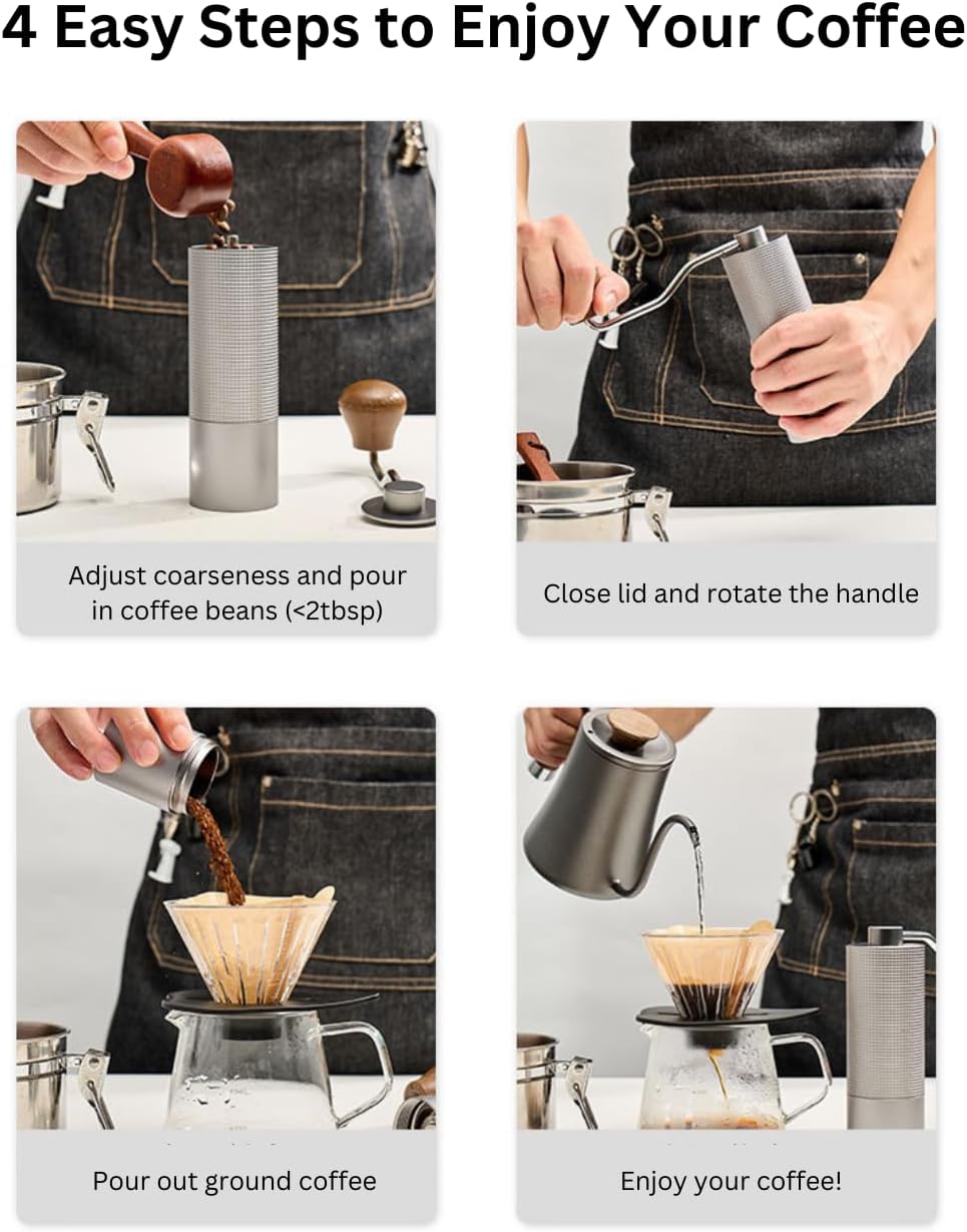 - Quite without any noise: The hand crank grinder eliminates 90% of electric grinder noise, offering a noise-free grinding experience. In addition, the temperature of the coffee beans will not rise during the grinding process, and the flavor of the coffee will be intact.