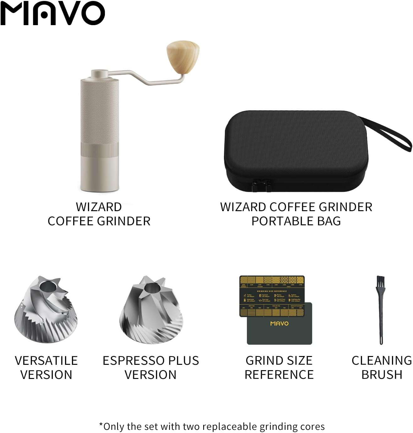 MAVO Manual Coffee Grinder, Wizard Hand Coffee Grinder, Capacity 25g with 2PCS CNC Stainless Steel Conical Burr -Pentagon and Hexagonal, Burr Coffee Bean Grinder for French Press, Pour Over, Silver