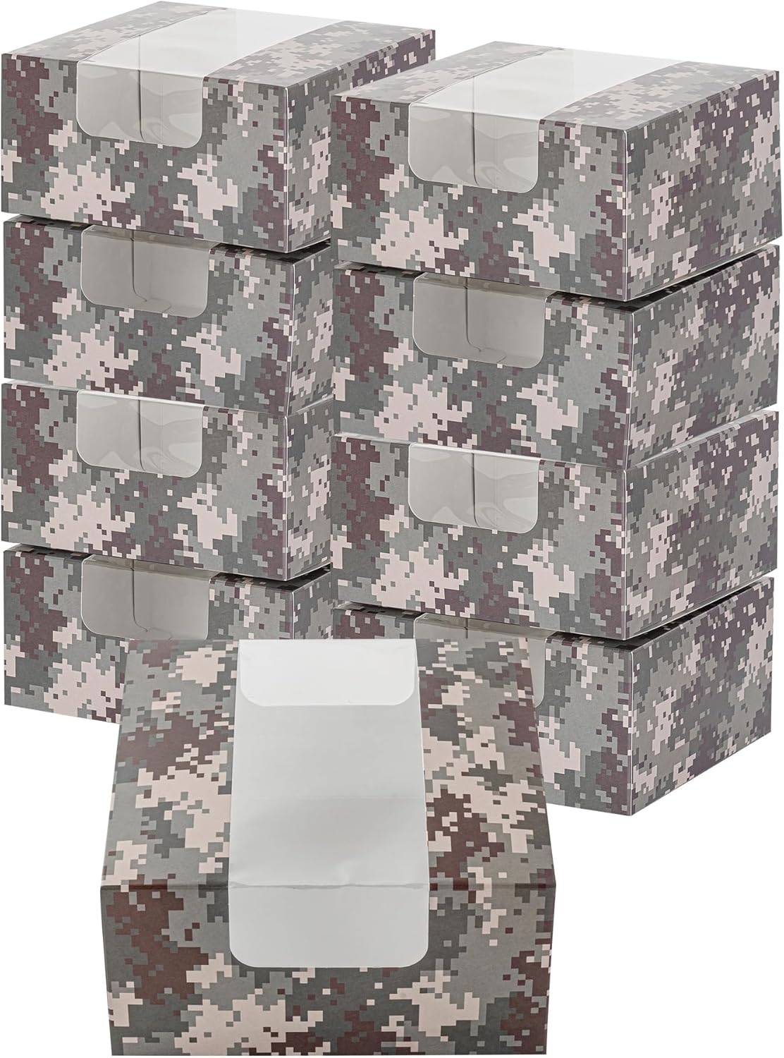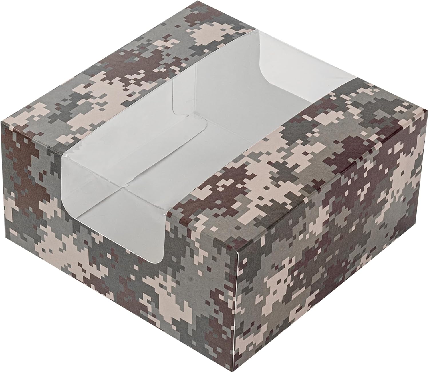 - CAMOUFLAGE FINISH: With a camouflage finish, these paper boxes with windows seamlessly match the colors of your event while highlighting the treats inside. Step up the presentation of baked goods!