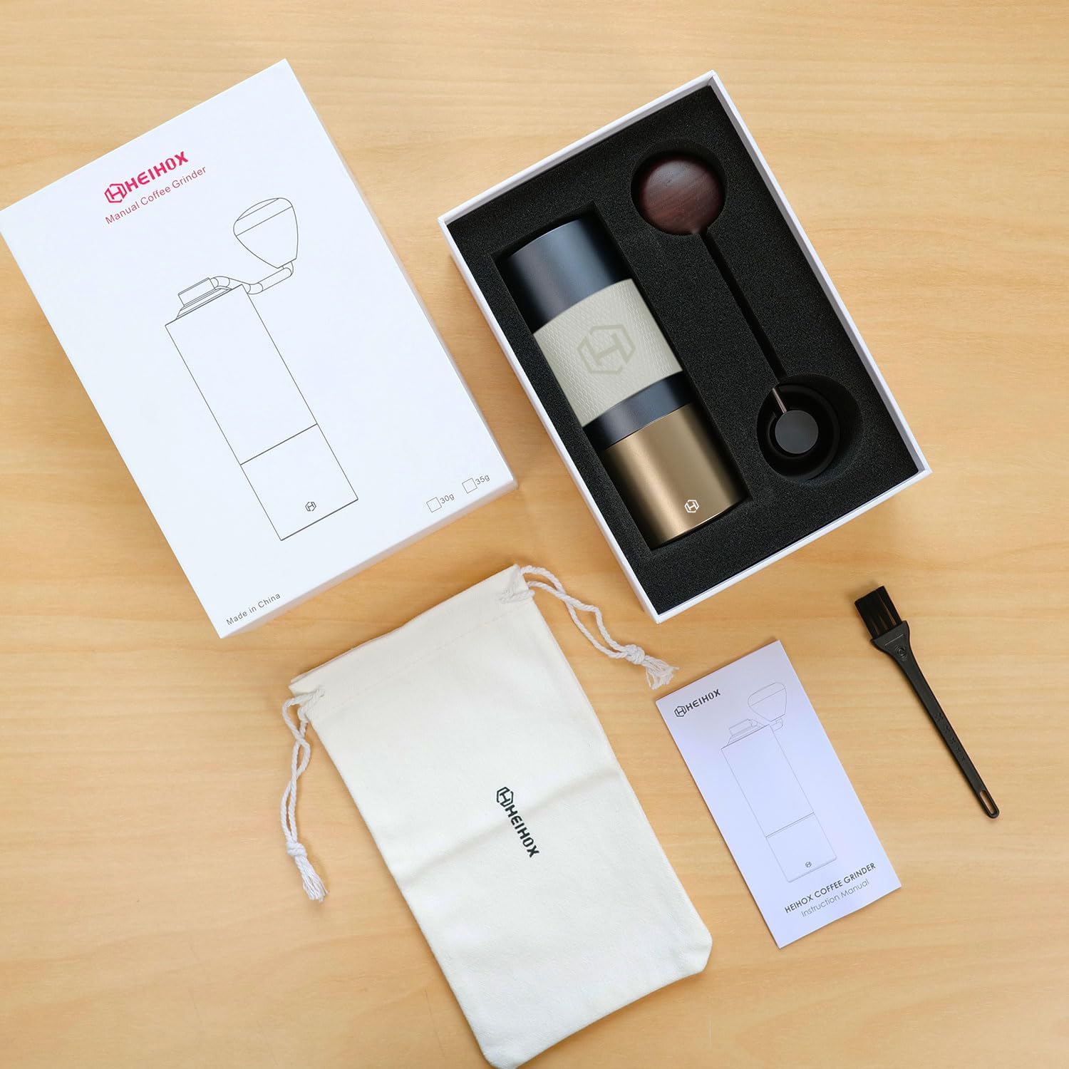 - TAKE IT EVERYWHERE - The HEIHOX Manual Coffee Grinder only takes up little space(2.2X7 inch), compact and lightweight. Manual grinding, not battery, power or cords needed to operate. Ideal hand coffee grinder for you to brew fresh ground coffee for camping grinder, hiking, backpacking trip. This set comes with a Manual Coffee Grinder, a Cleaning Brush and a Drawstring Bag.