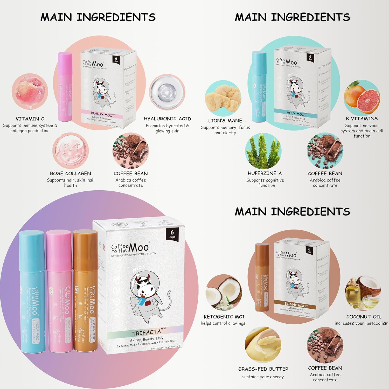 - 📦 The Complete Coffee Concentrate Pack - Trifacta Mini Pack offers 2x Skinny Moo, 2x Beauty Moo, and 2x Holy Moo blends, catering to various lifestyles and wellness goals like boosting brain function, or improving your hair, skin, and nails.