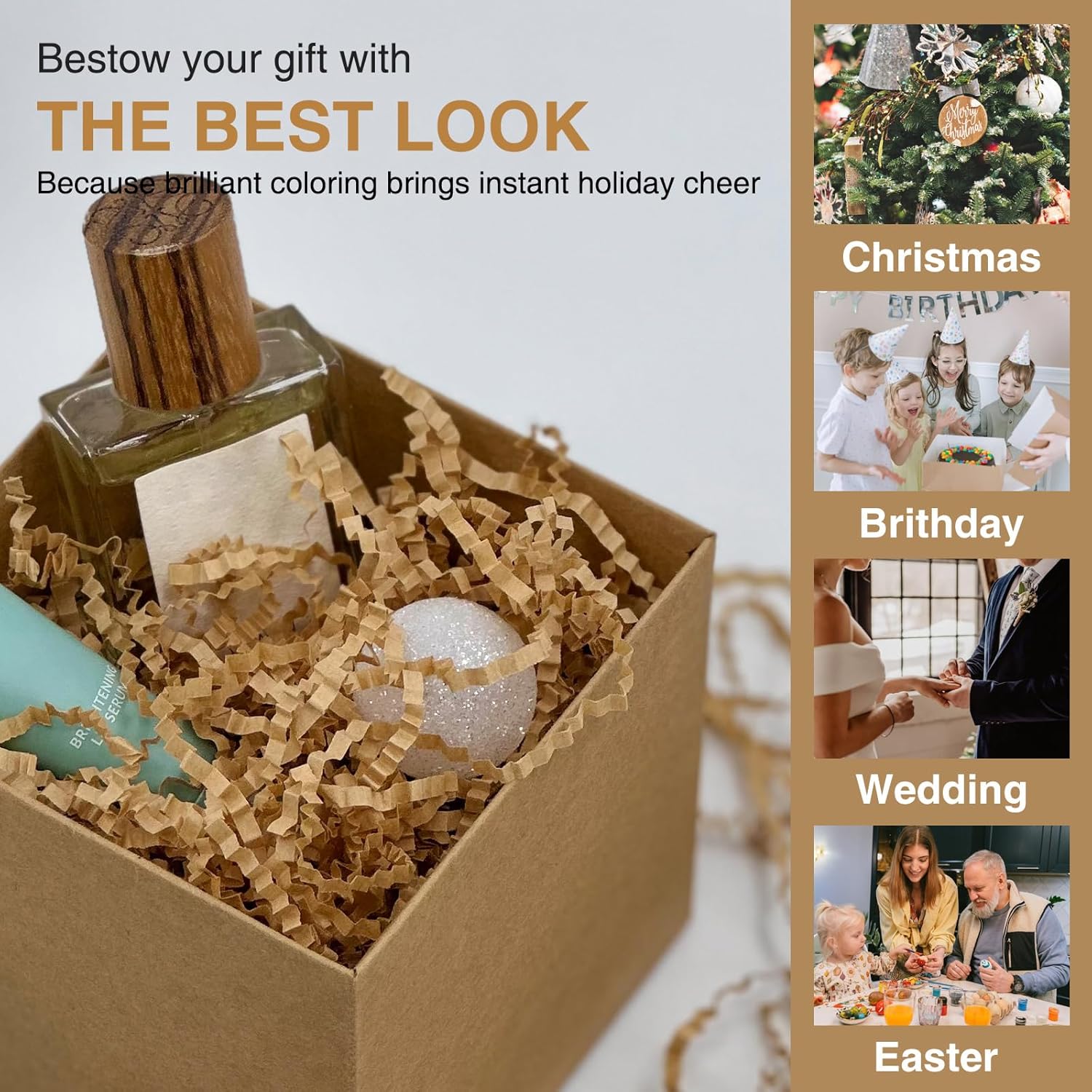 - Widely Use: This is the ideal shredded paper for gift baskets, packing, shipping, and lining delicate.Whether it's an anniversary christmas, wedding, birthday or other party, our crinkle cut paper shred filler is the best choice for your gifts.