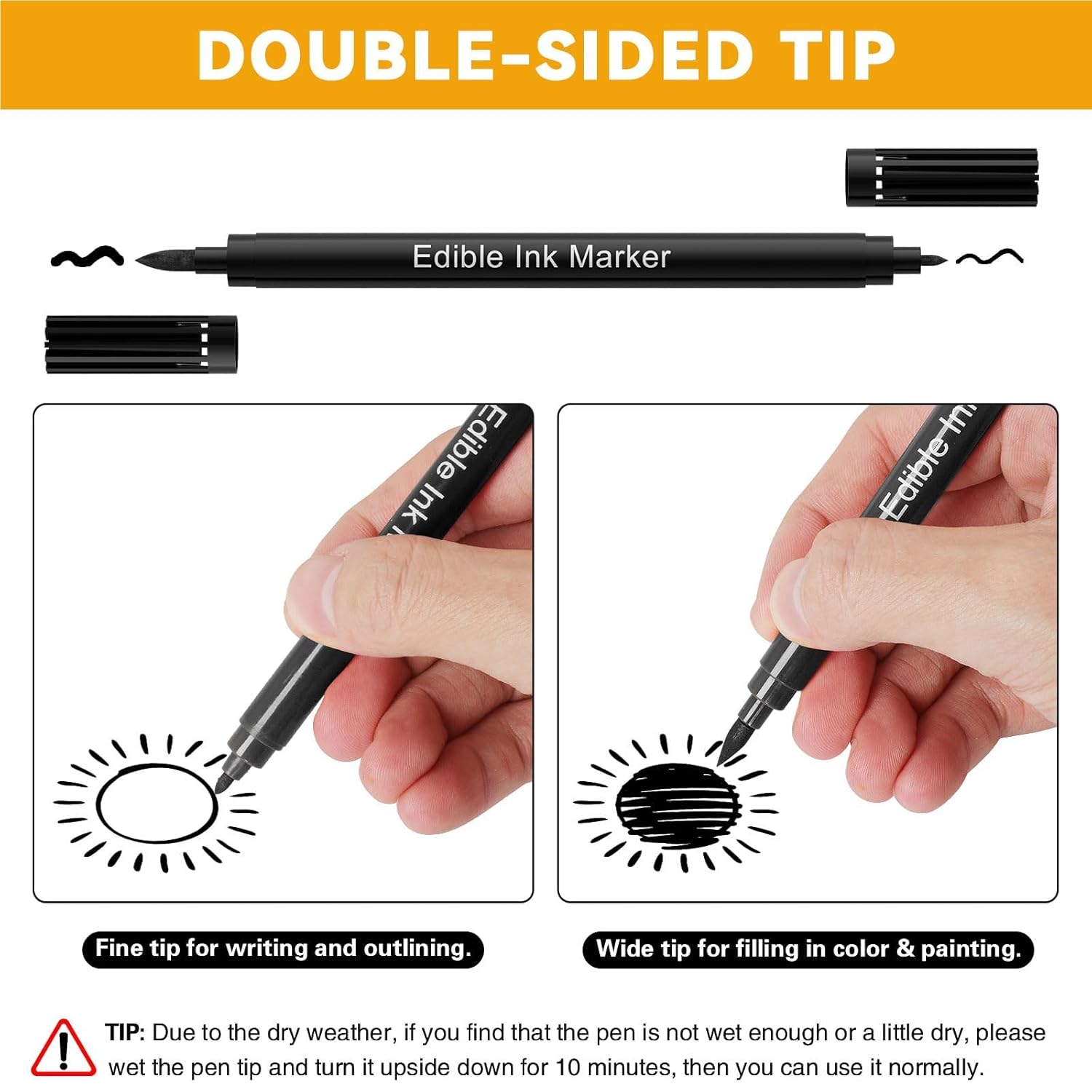 - 【 Upgrade Dual Tips】This edible pen is double-pointed with wide and upgrade thin tip:Upgrade thin tip(0.5mm ) works for detail work,wide tip works well for infills or larger areas that are to be colored. Ink increases by 30%.More Creation,More Fun!(Note:Remember to cover the caps after use)