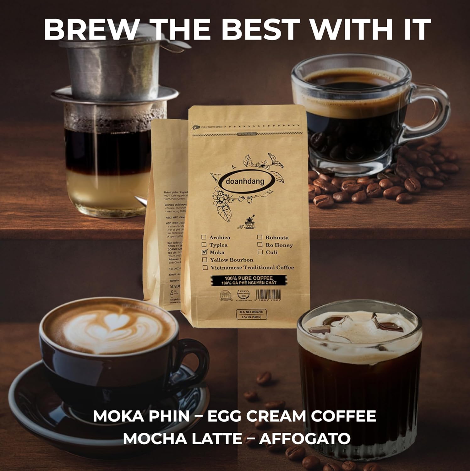 doanhdang - 17.6 Oz Premium Moka Whole Bean Coffee, 100% Medium Roast, Rich Flavor for Espresso Shot and Brew, Origin from Vietnam, Whole Med Roast Beans