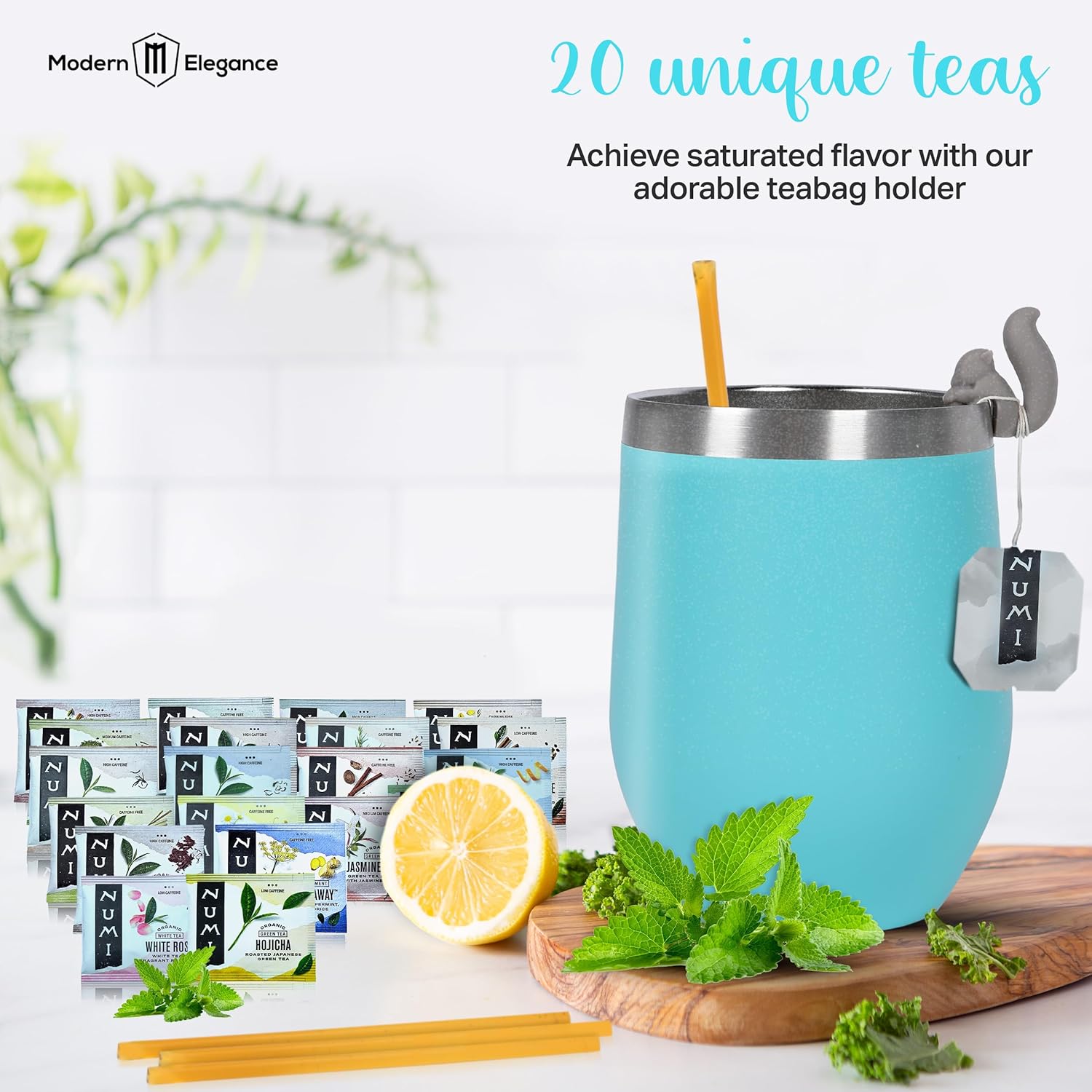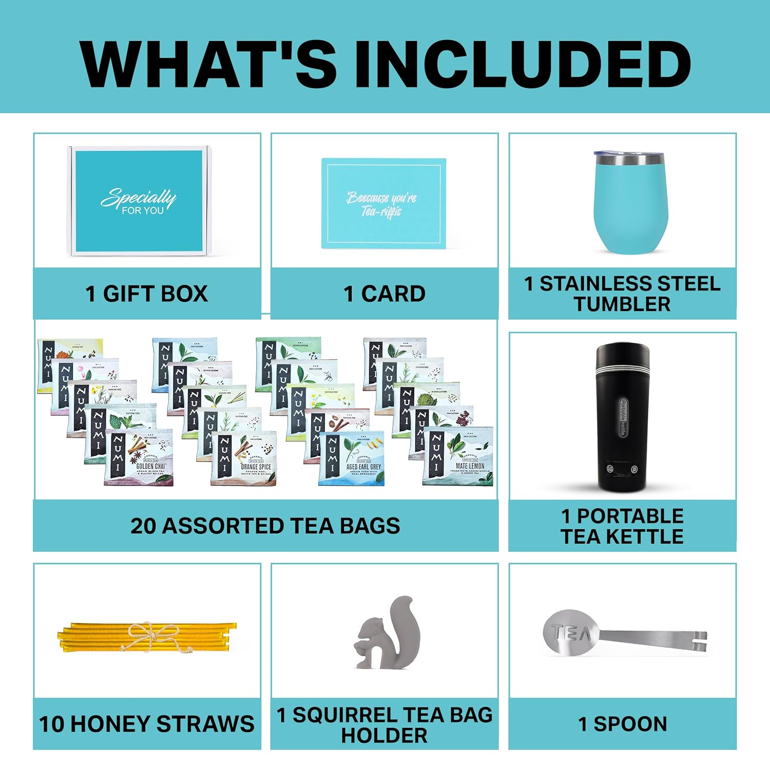 - Tea Gift Set with Kettle - Discover the joy of tea with our luxurious Tea Gift Set, thoughtfully assembled in a beautifully crafted gift box. This set is a treasure trove that includes 20 assorted organic teas, a sleek 12oz vacuum insulated tumbler, a high-quality stainless steel kettle, 10 pure honey straws, a tea-spoon squeezer, a charming silicone squirrel tea bag holder, and a greeting card for personalized touches. An ideal tea gift set for women and all tea lovers. Perfect for mothers day, mom gifts, new mom gifts, or gift for mom