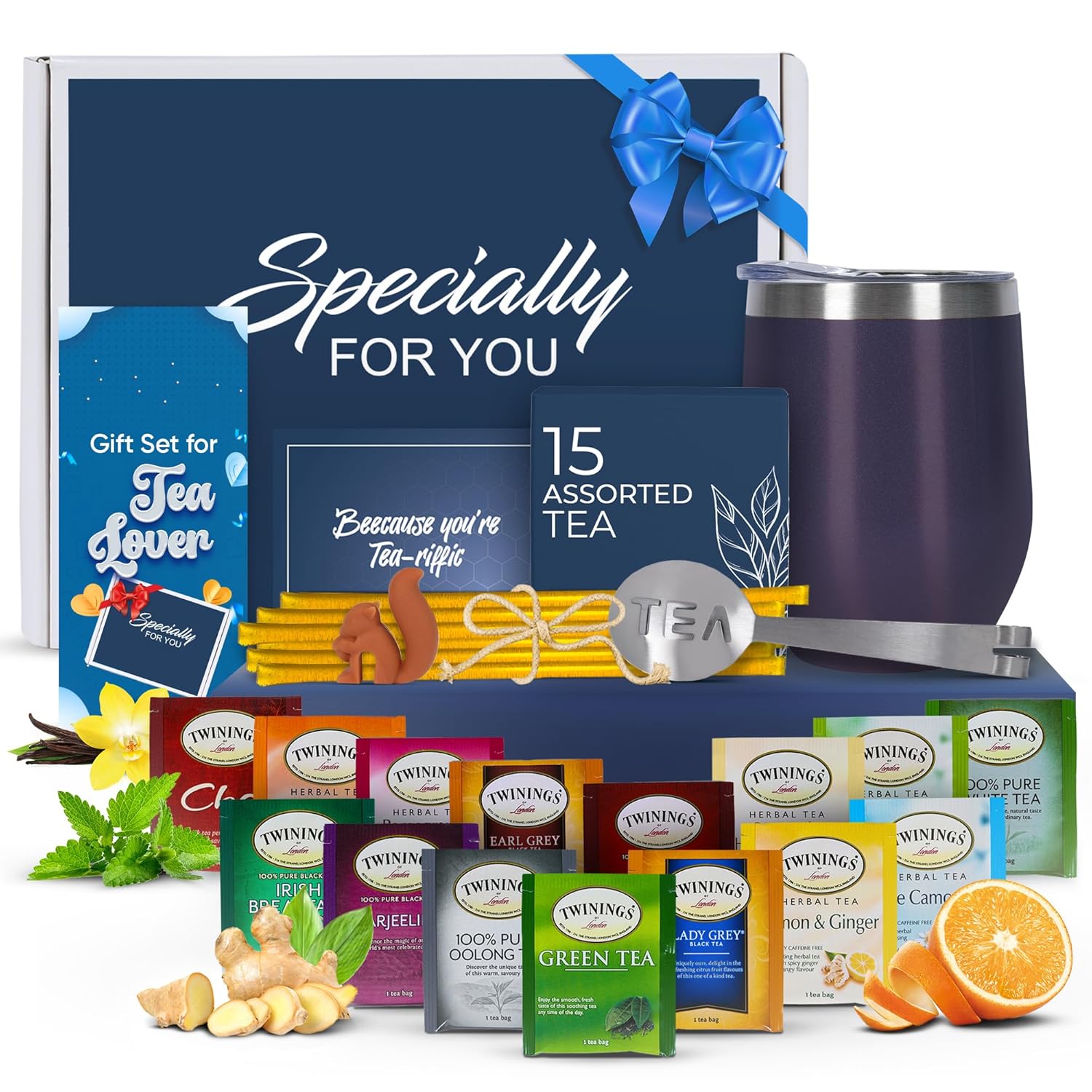 - TEA GIFT SET - Indulge in the ultimate tea experience with our luxurious Tea gift set, beautifully presented in a sturdy, elegant gift box. Modern Elegance tea gift sets for tea lovers basket includes a 12oz vacuum insulated tumbler, a tea collection sampler of 15 unique flavor blends, 10 pure honey straws, a tea-spoon squeezer, a cute squirrel tea bag holder, and a greeting card to write a personal message. The perfect tea gift for tea lovers women , men or as a get better soon care package.