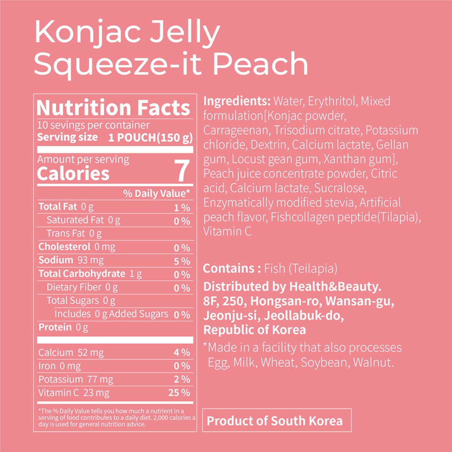 Korean Food Low Calories Squeeze Konjac Jelly, Peach Flavor, Fish Collagen, Vitamin, Zero Sugar, Chewier Texture, Health&Beauty (Net WT 5.07 oz, Pack of 10) 곤약젤리