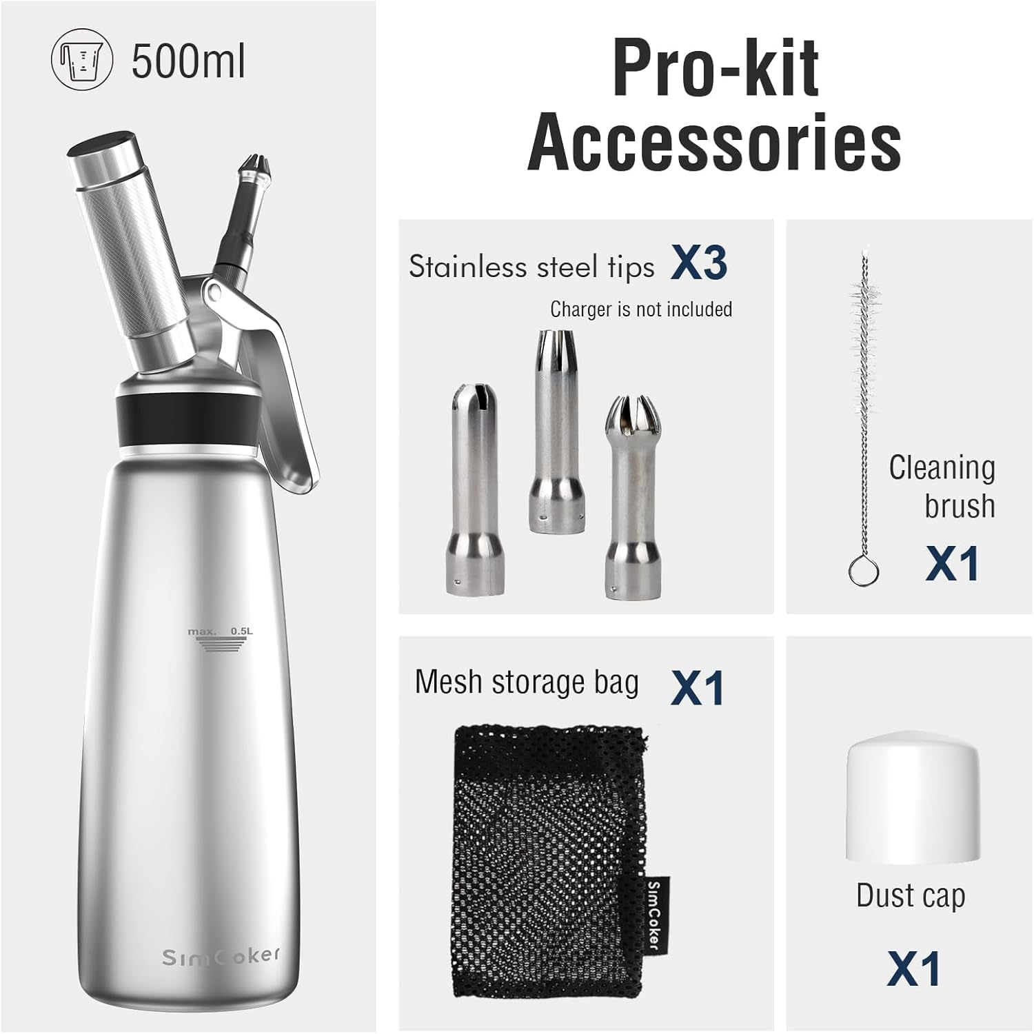 - 【Food Grade Aluminum】: The SimCoker Cream Whipper is a quality craft tool designed for food service.Aluminium is lightweight, effortless to hold and corrosion-resistant for longer life. This cream whipper is made from non-hazardous materials that are safe and healthy to use.The 500ml capacity is perfect for home dessert makers and professional chefs alike