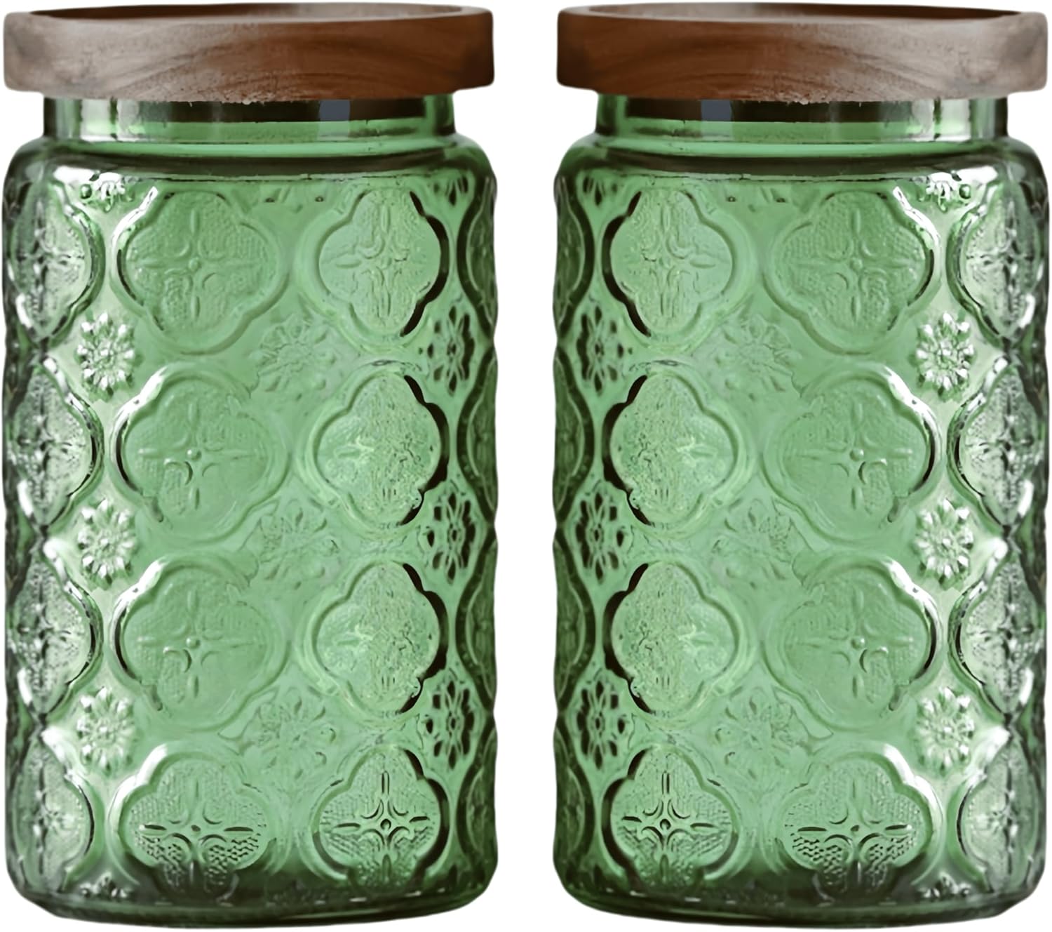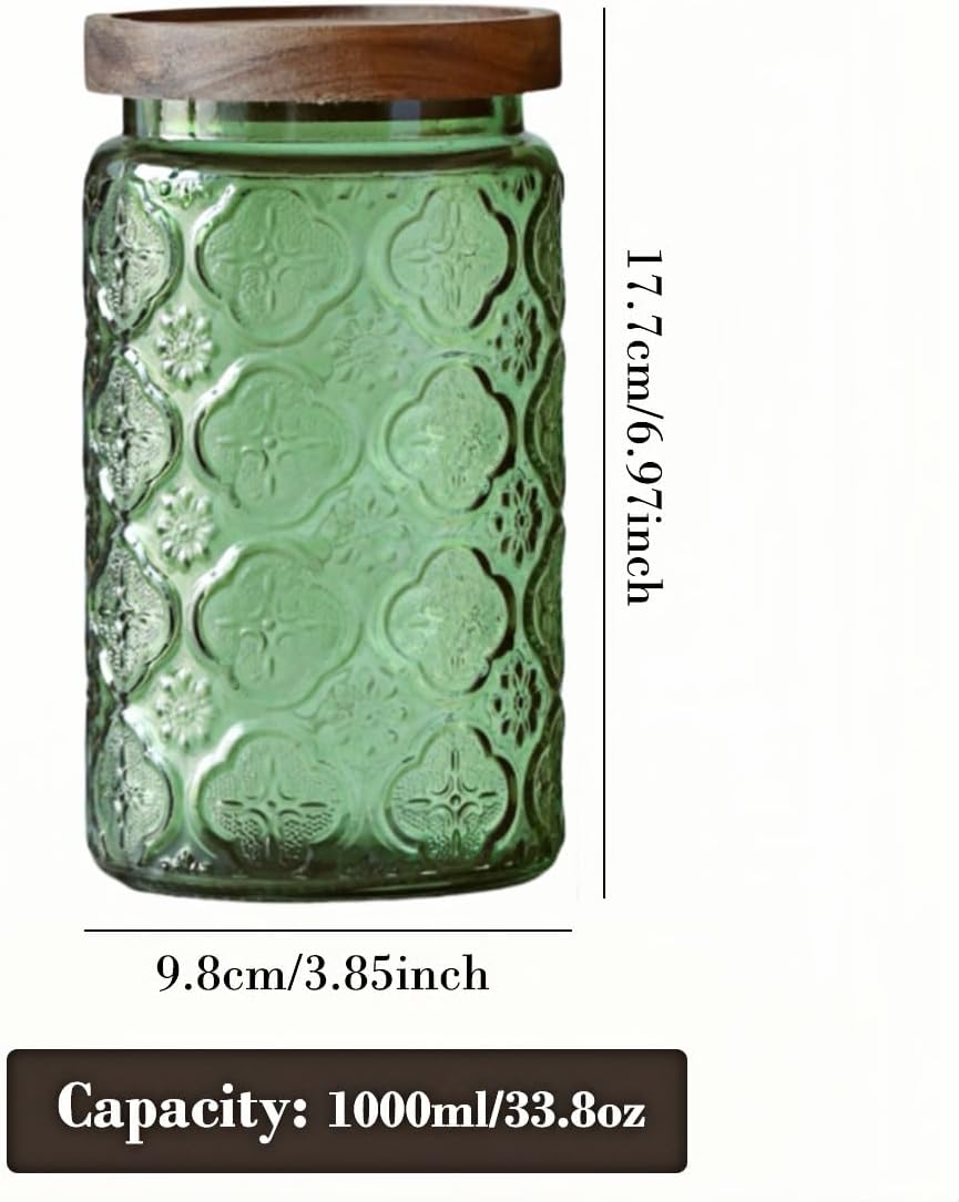 ANSQU Set of 2 Vintage Glass Storage Containers, Green Glass Jars with Wooden Lids, 34 FL OZ Decorative Jars for Kitchen Storage Cabinets for Coffee, Jam, Candy, Cookie (Green Begonia)