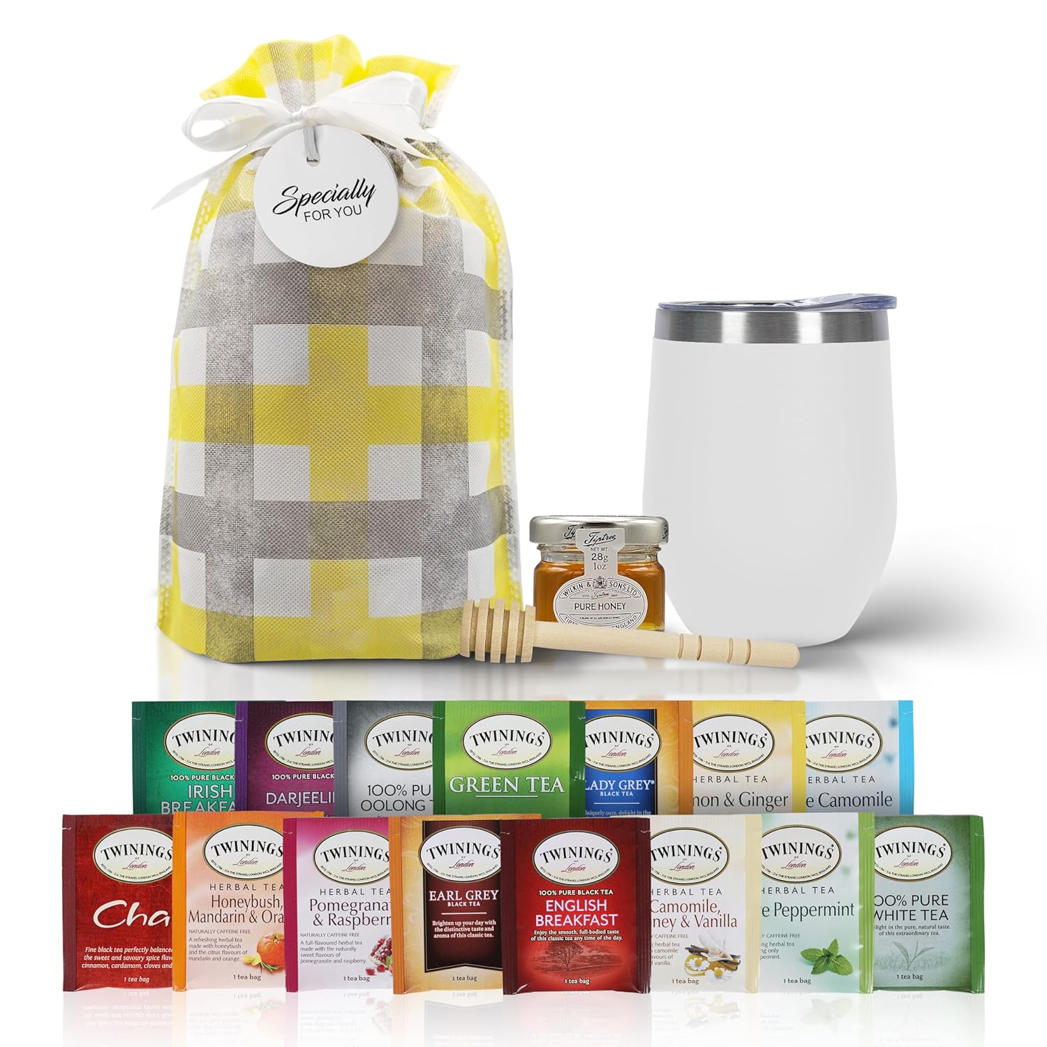 - Thoughtful Tea Gift Basket - Send your warmest wishes with this beautifully curated tea gift set. Includes a tea sampler, an elegant vacuum insulated stainless steel tea mug, and a jar of natural honey. Perfectly presented in a stylish drawstring gift bag, this set is ideal for any occasion. mothers day gifts, gifts for mom
