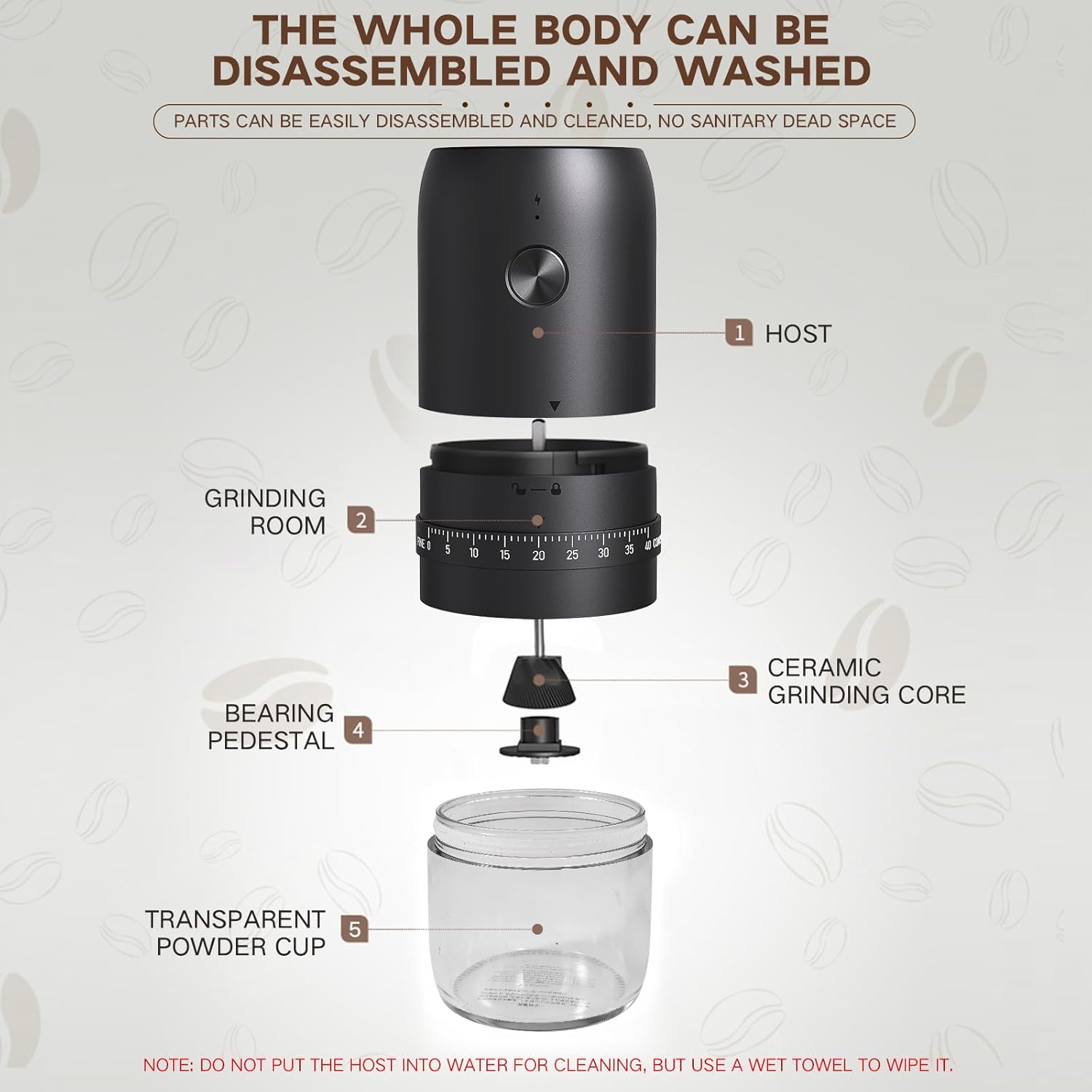 - 【Hassle-Free Cleaning】 The rounded shape and three-stage design, along with a detachable body, make cleaning a breeze. The included brush easily removes residual coffee powder, and the grinding cavity and transparent tank can be cleaned with water. Made with ABS and ceramic, ensuring safety and hygiene. Note: The part of host is forbidden to be washed with water.