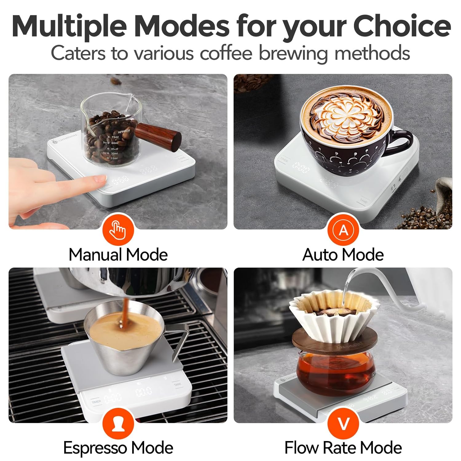 - 【4 Modes and 3 Units】: This espresso scale offers manual mode, auto mode, espresso mode, and flow rate mode, allowing you to easily start or stop automatic timing and weighing. Espresso coffee scale with timer accurately displays the ratio of coffee grounds to water and monitors real-time water flow during brewing. Whether you're making pour-over or espresso, it ensures precise extraction. The coffee scale espresso supports 3 units (g/oz/ml), which can be switched effortlessly to meet various needs.