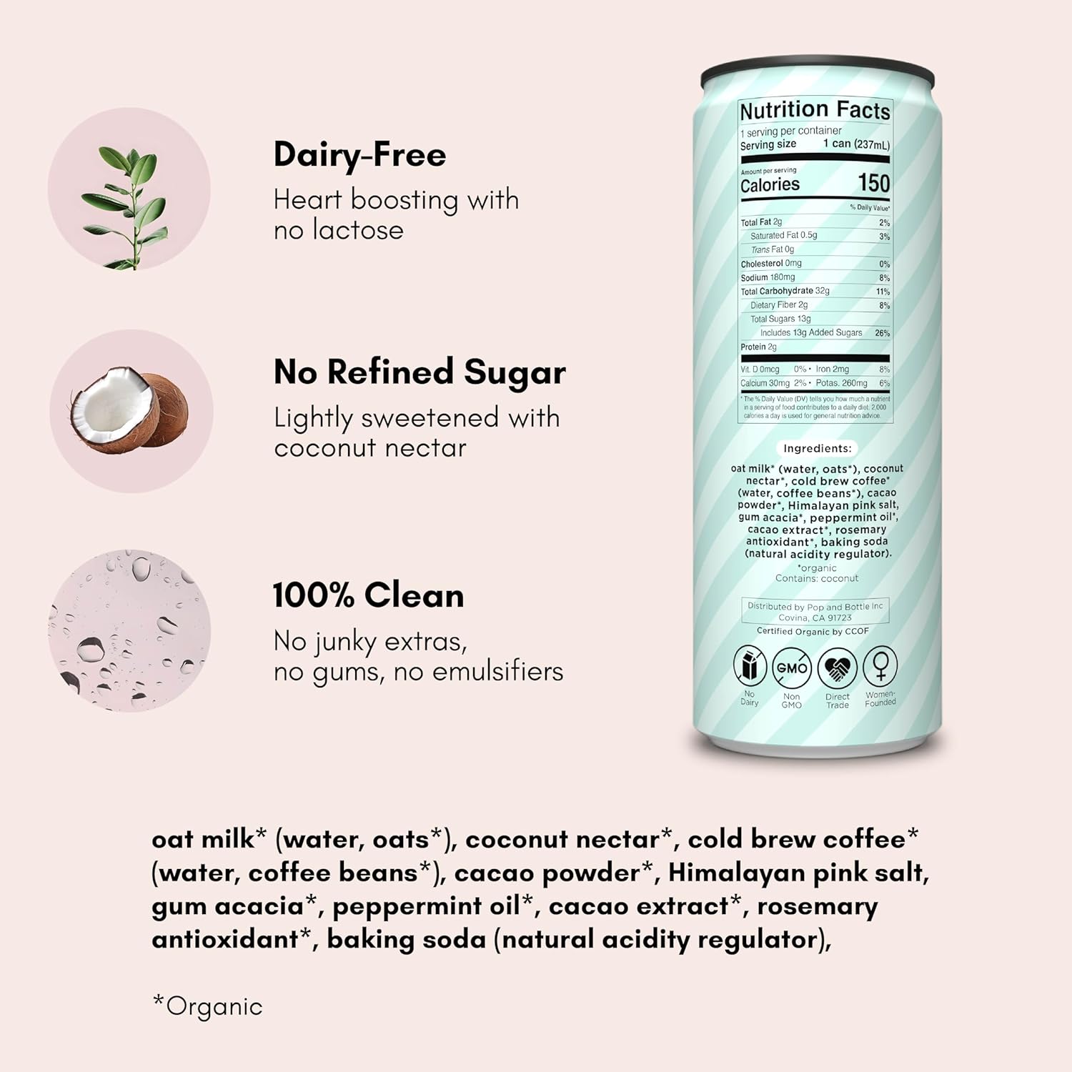 Pop & Bottle Oat Milk Lattes- Cold Brew, Cold Brew Coffee Cans, Canned Coffee, Iced Coffee, Organic, Dairy Free, Gluten Free, Lightly Sweetened with Coconut Nectar- Peppermint Mocha, 8 Fl Oz (12 Pack)