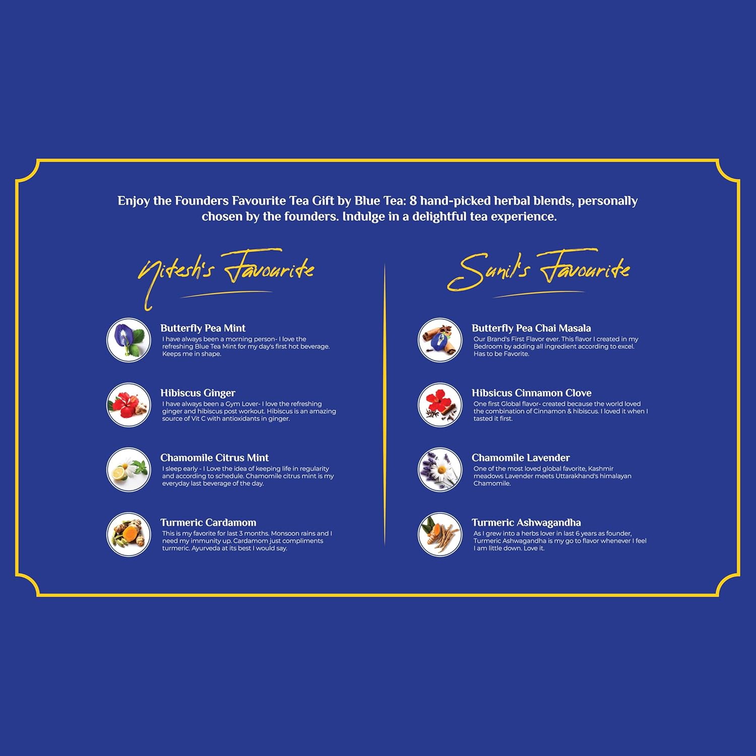 - ASSORTMENT PACK: The gift hamper contains 8 flavours of herbal teas with 5 tea bags each. The flavors are:- Butterfly Pea Mint, Hibiscus Ginger, Chamomile Citrus Mint, Turmeric Cardamom, Butterfly Pea Chai Masala, Hibiscus Cinnamon Clove, Chamomile Lavender, and Turmeric Ashwagandha. Every flavour comes with their unique health benefits. Butterfly Pea supports , Hibiscus boosts collagen for glowing skin, Chamomile soothes for restful sleep, and Turmeric strengthens immunity.