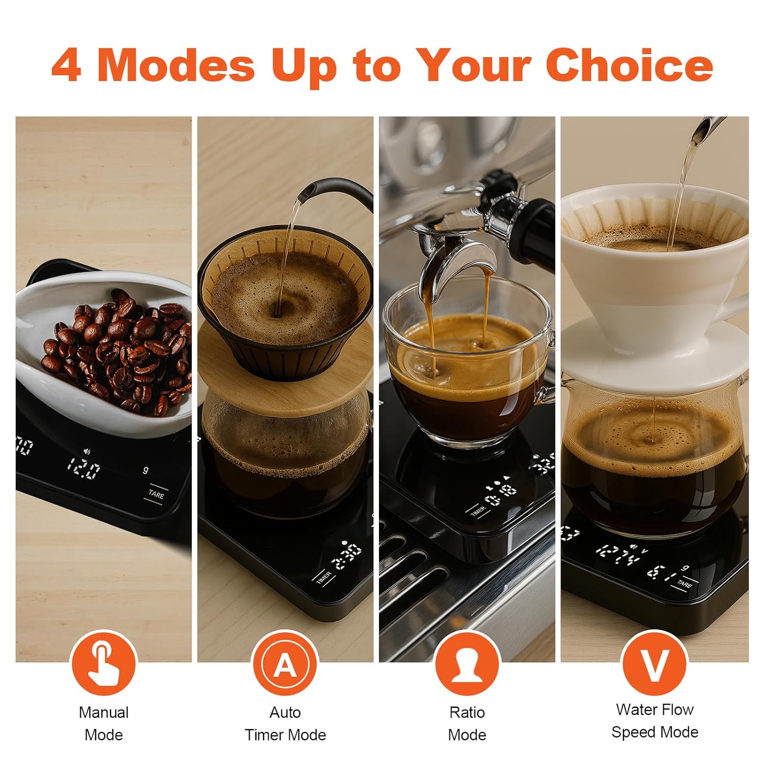 - 4 Modes, 3 Units: Personalize your coffee experience with manual, auto-timing, powder-to-water ratio, and flow rate modes. This espresso scale easily switches between grams, ounces, and milliliters to match your brewing preferences, making every cup of coffee unique