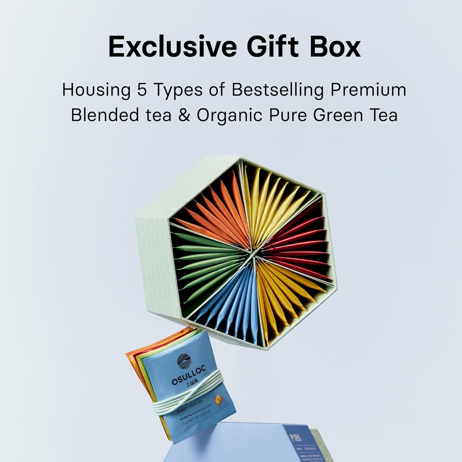 - [Alluring Variety for Daily Delight] Discover a new favorite every day with OSULLOC's VARIATION ESSENCE tea set, consisting of 6 distinct flavors. Savor the diversity of Korea's finest teas with each meticulously curated tea bag, ensuring a unique and refreshing experience with every cup. Containing pure organic green tea, Beloving black tea, and aromatic blended tea.